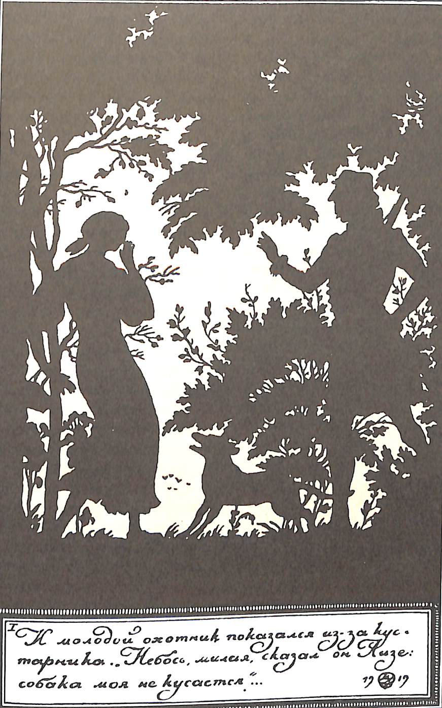 В иллюстрациях к "Повестям Белкина" в этом сборнике много отсебятины — к "Барышне-крестьянке" поместили дополнительно два рисунка Добужинского из других циклов. Однако нужные нам силуэты там со всеми мелкими деталями — сканы даю из этого издания.