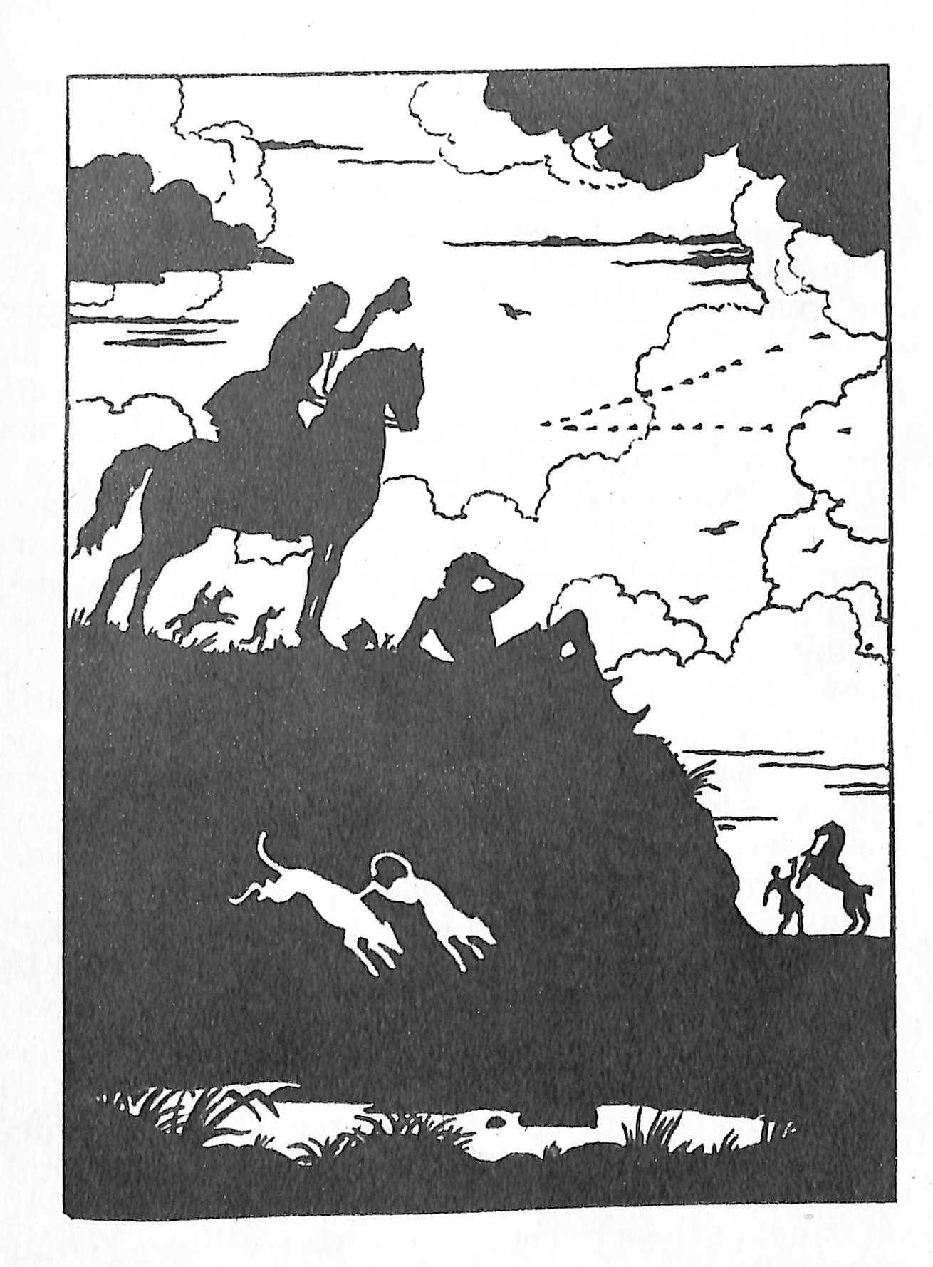 А иллюстрации хороши. Вот напряжённая сцена охоты на зайцев (когда либерал Муромский свалился с лошади перед оврагом). Добужинский уже использует белый силуэт на чёрном поле, сочетая его с традиционными чёрными силуэтами.