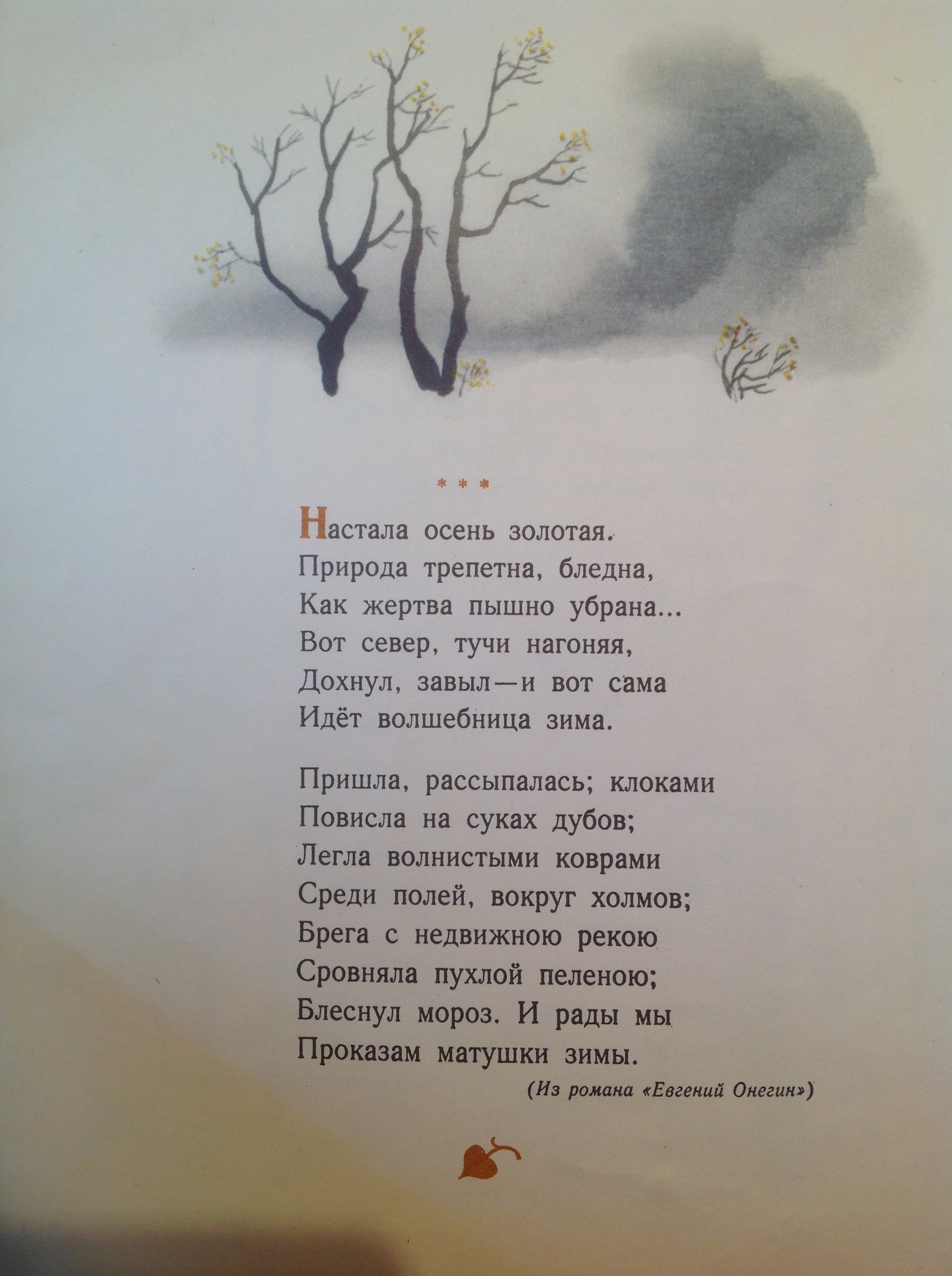 Из Пушкина только три стихотворения: два отрывка из "Онегина" и "Зимнее утро". Каждому посвящёно по книжному развороту.