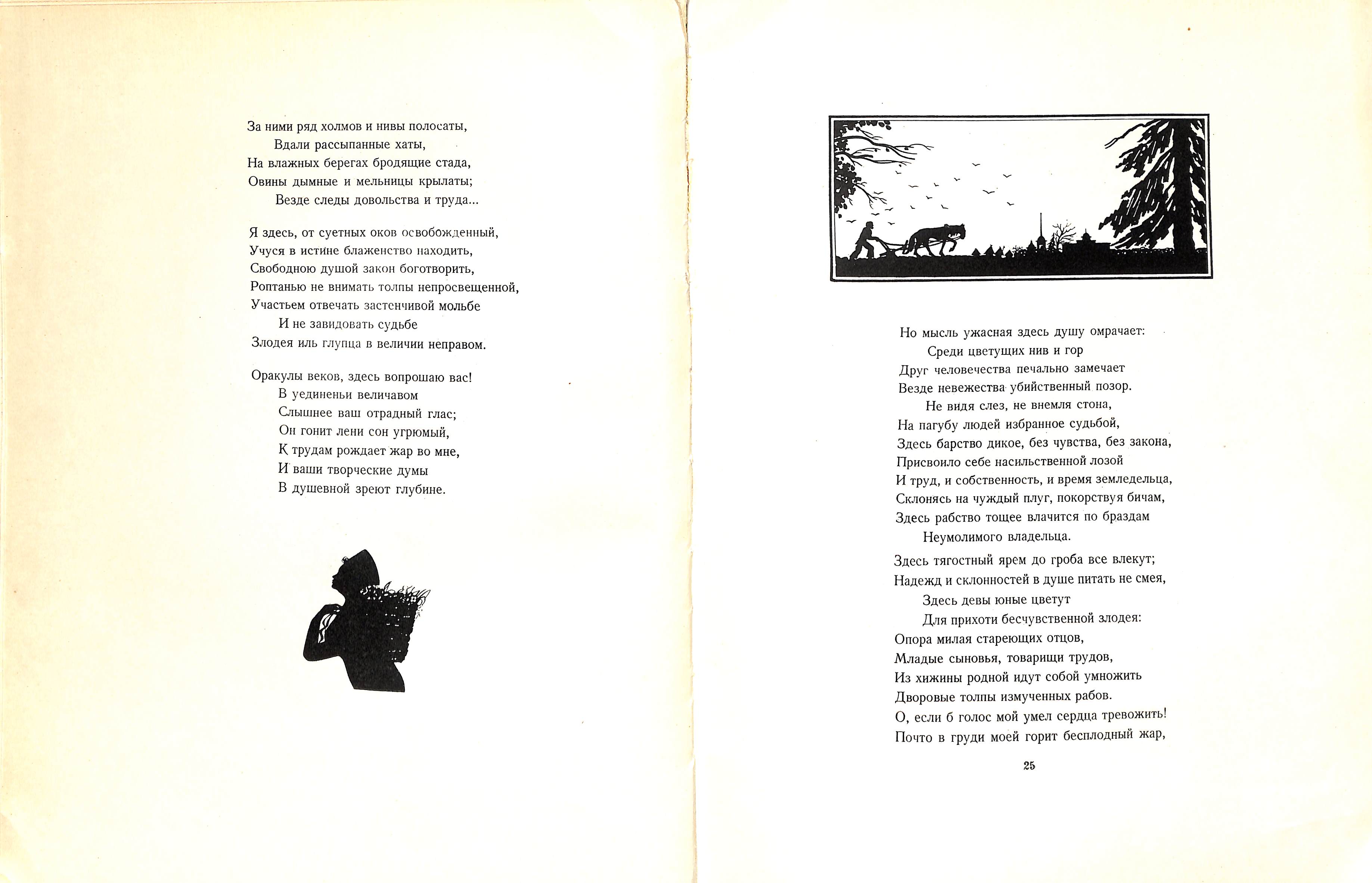 2) В начальных строфах — восторг и упоение. Тема, конечно, обычная для поэзии старших современников — Жуковского, Батюшкова (молодой Пушкин пока ещё разрабатывает этот пласт): природная неиспорченность противопоставляется бездуховному высшему обществу. Ильин даёт на первом развороте силуэты крестьянки с ребёнком. И Пушкина, который на полном серьёзе учится у крестьян "в Истинне блаженство находить".