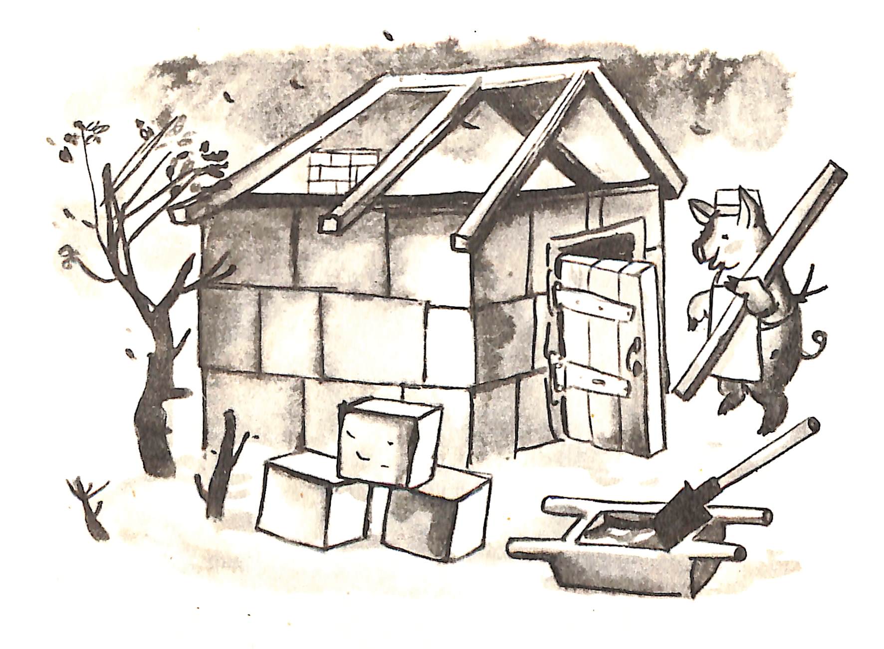 Домик, который можно разрушить дуновением. А непохоже — просто в домике открыта дверь, что и позволило волку сожрать поросёнка: