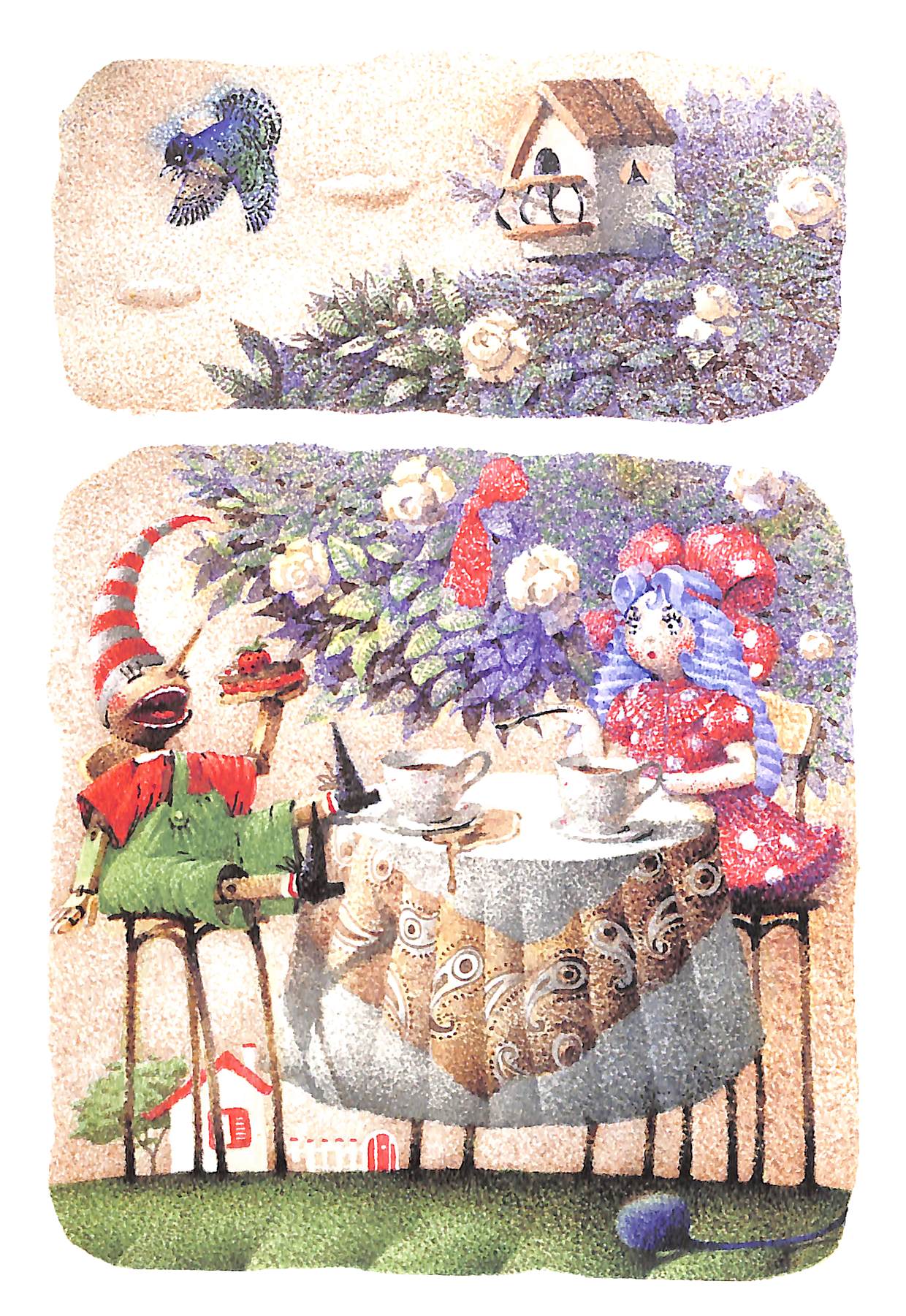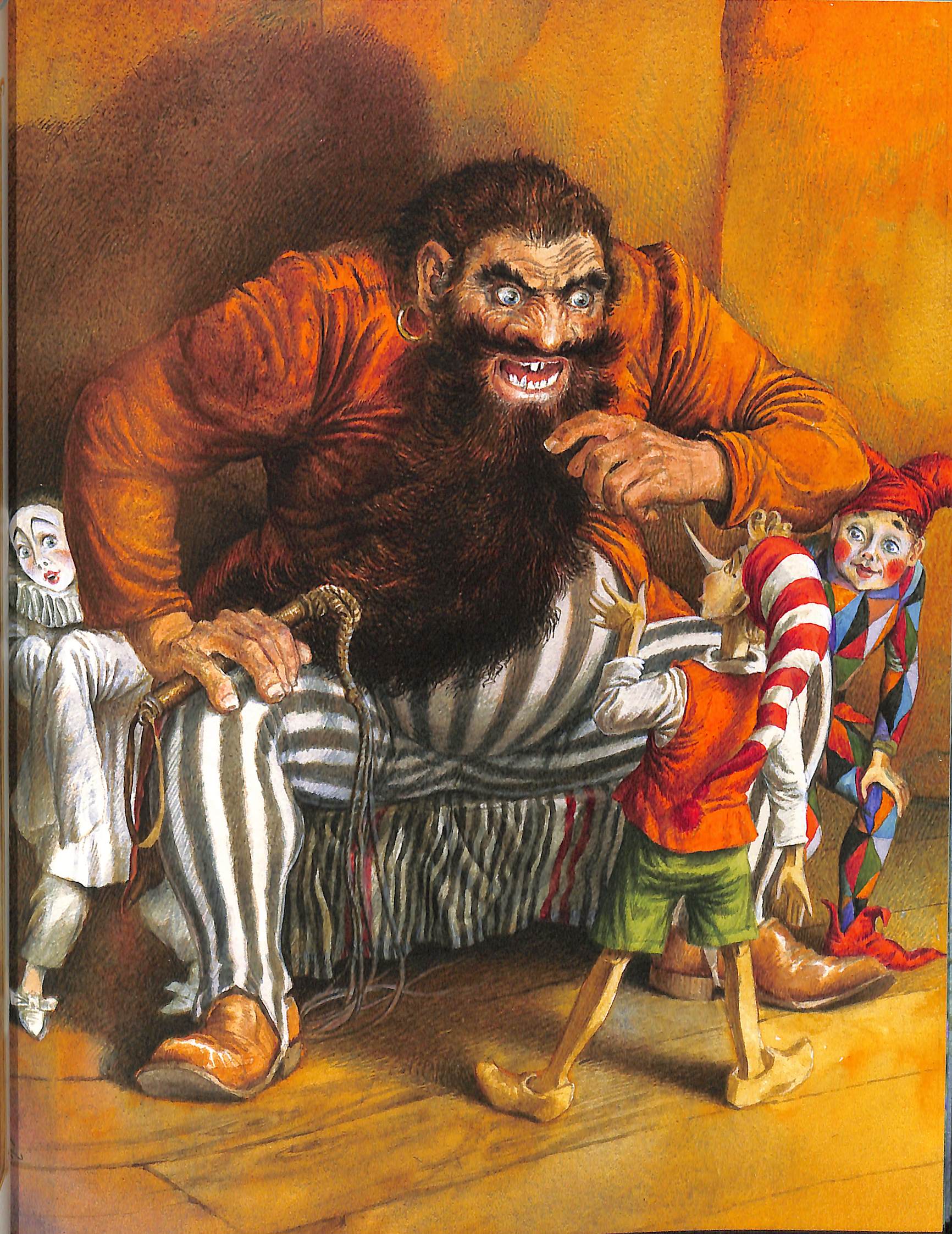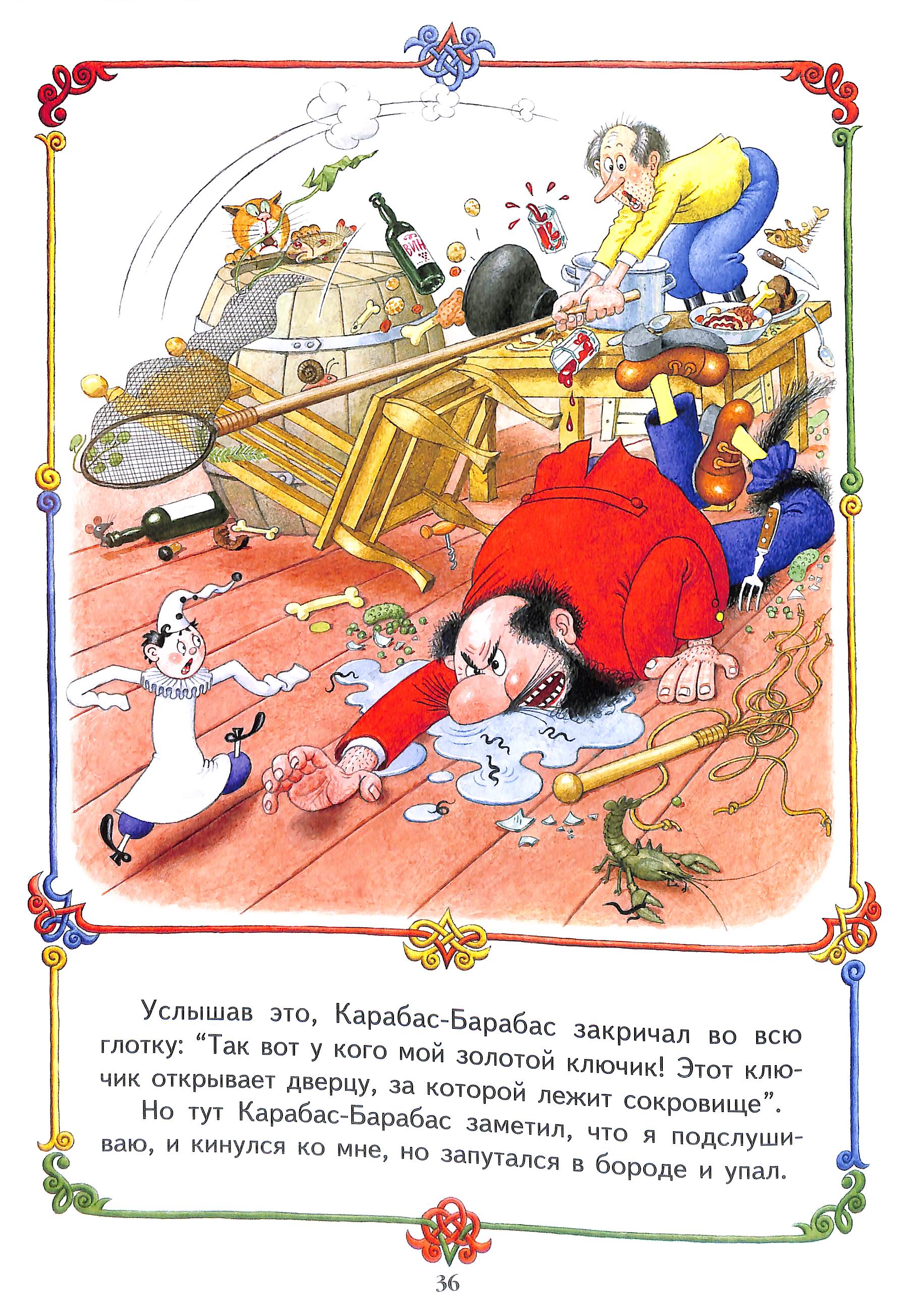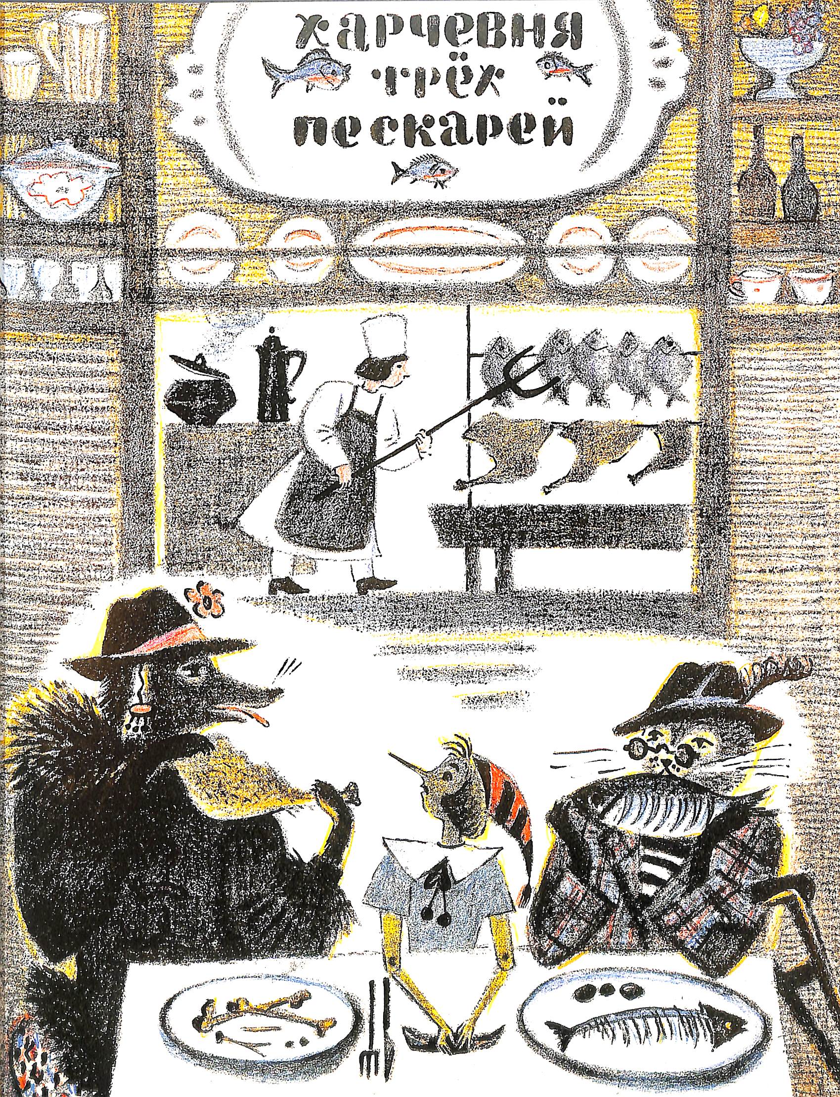 Первое знакомство Буратино с Папой Карло художник вообще опускает. Папа Карло мельком появляется в самом конце в благостной обстановке — неинтересно.