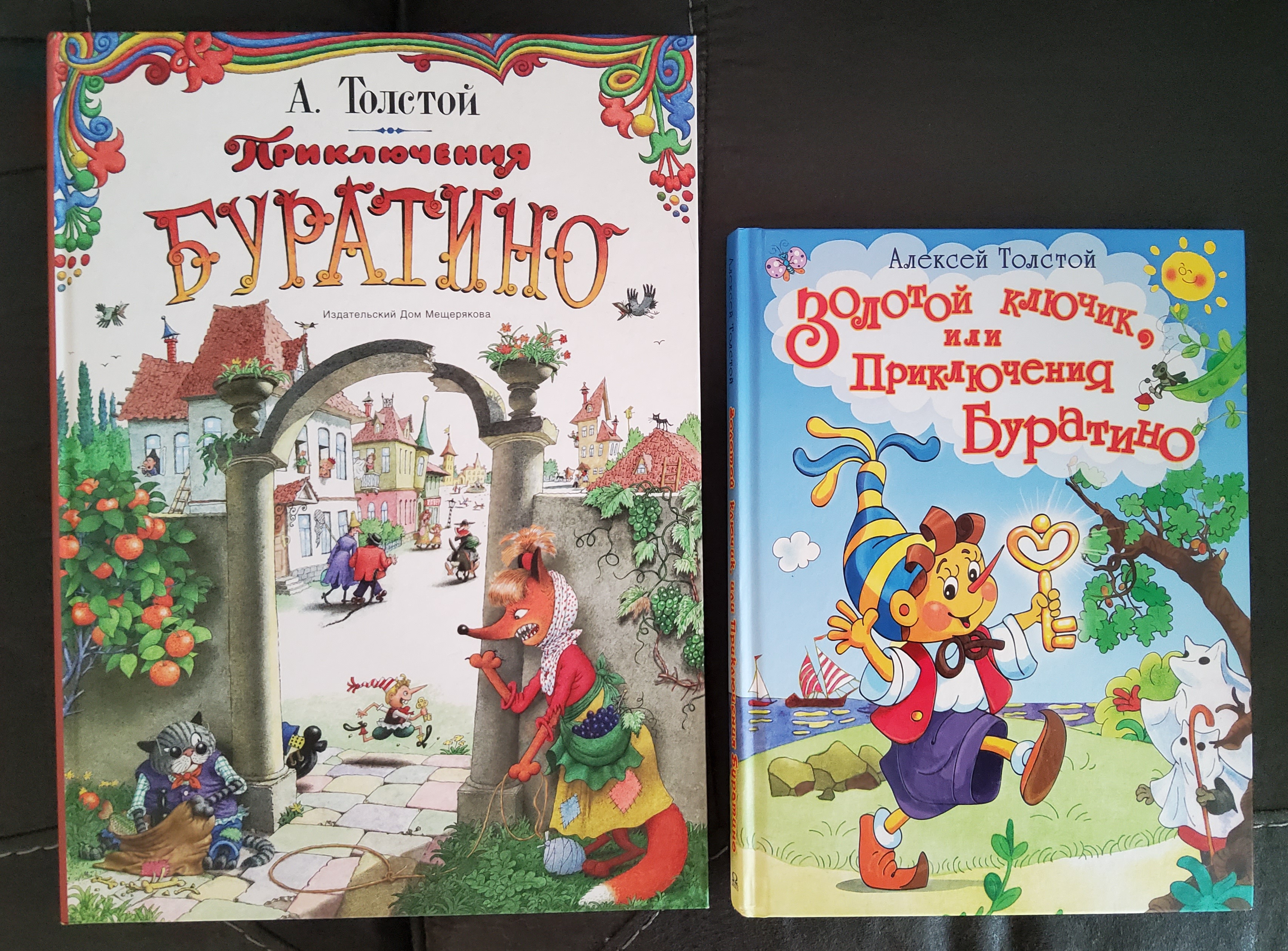 Слева — Огородников ("Приключения Буратино", т.е. сокращённый самим автором текст для комикса), справа — Полухин ("Золотой ключик или Приключения Буратино", т.е. полный текст).