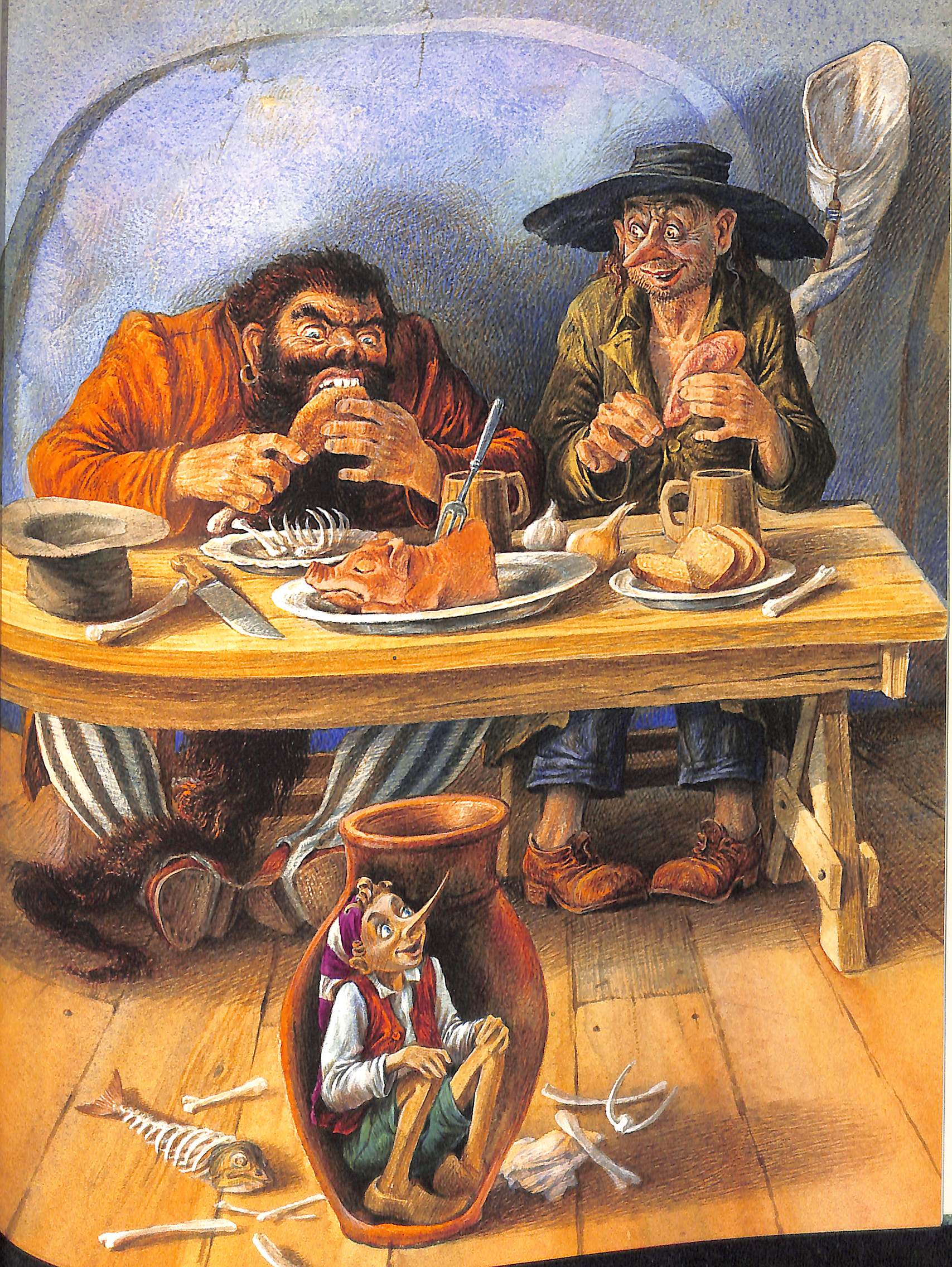 1) За что советские критики упрекали Огородникова — за то, что он обувь всегда рисовал в форме круглых дутышей. В отношении Папы Карло художник пошёл на нарушение принципов: обувь у него остроносая. А так — типичные огородниковские картинки. Художник своей едкой фантазией дополняет текст: у Джузеппе, например, на верстаке стакан вина и огурец на закуску; Папа Карло нашивает заплату на штаны (и чего только на полу не валяется!).
