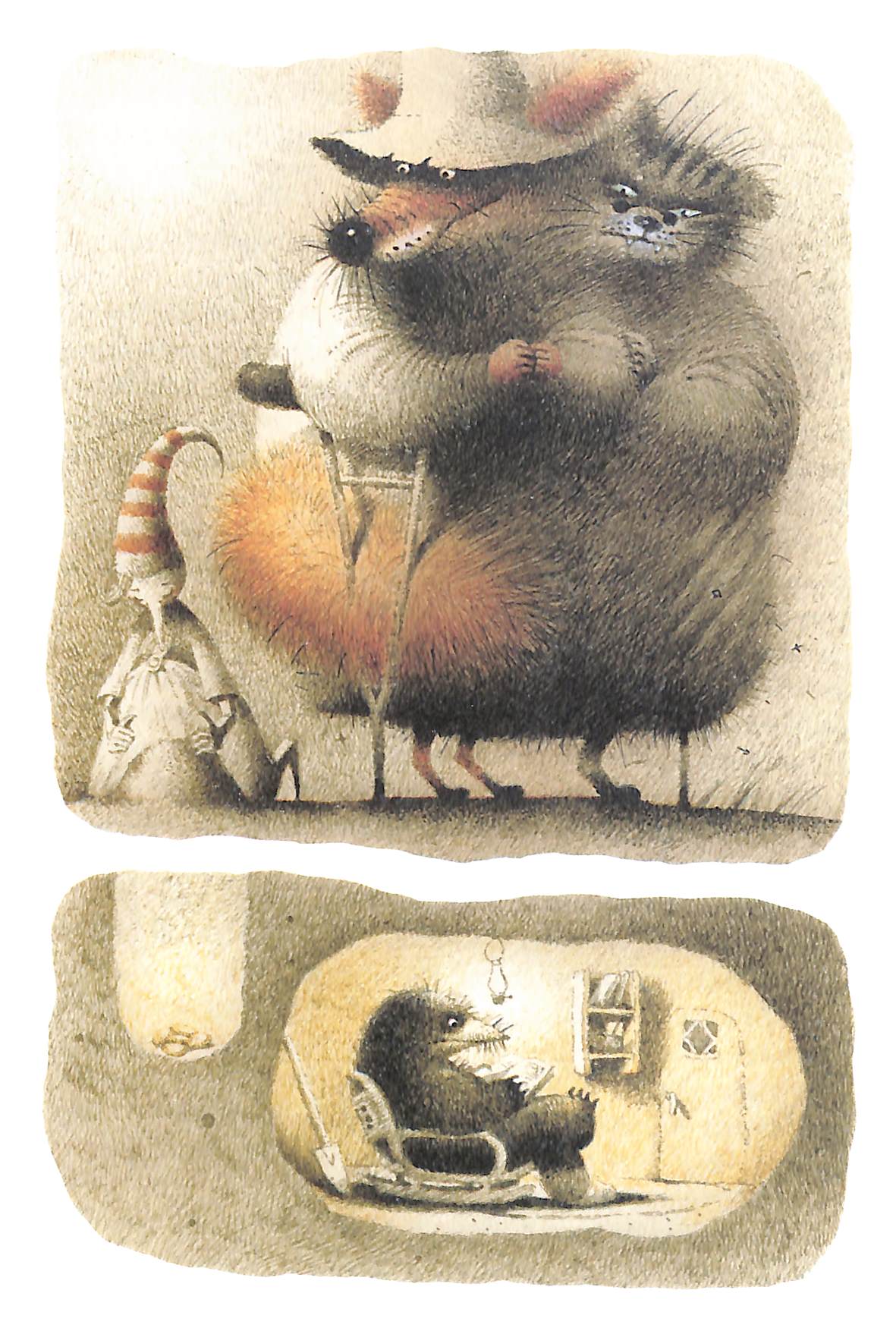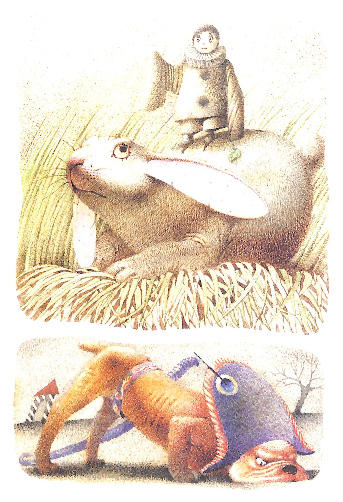 Джаникьян — художник концептуальный. Сопровождающих иллюстраций, дублирующих текст, у него нет. Но и зауми тоже нет. Художник разработал собственный почерк, и теперь может просто представлять статичных персонажей — их необычный вид привлекает внимание. Вот — в качестве примера — второстепенные скучные персонажи: хозяин харчевни и черепаха Тортилла. Полный восторг.