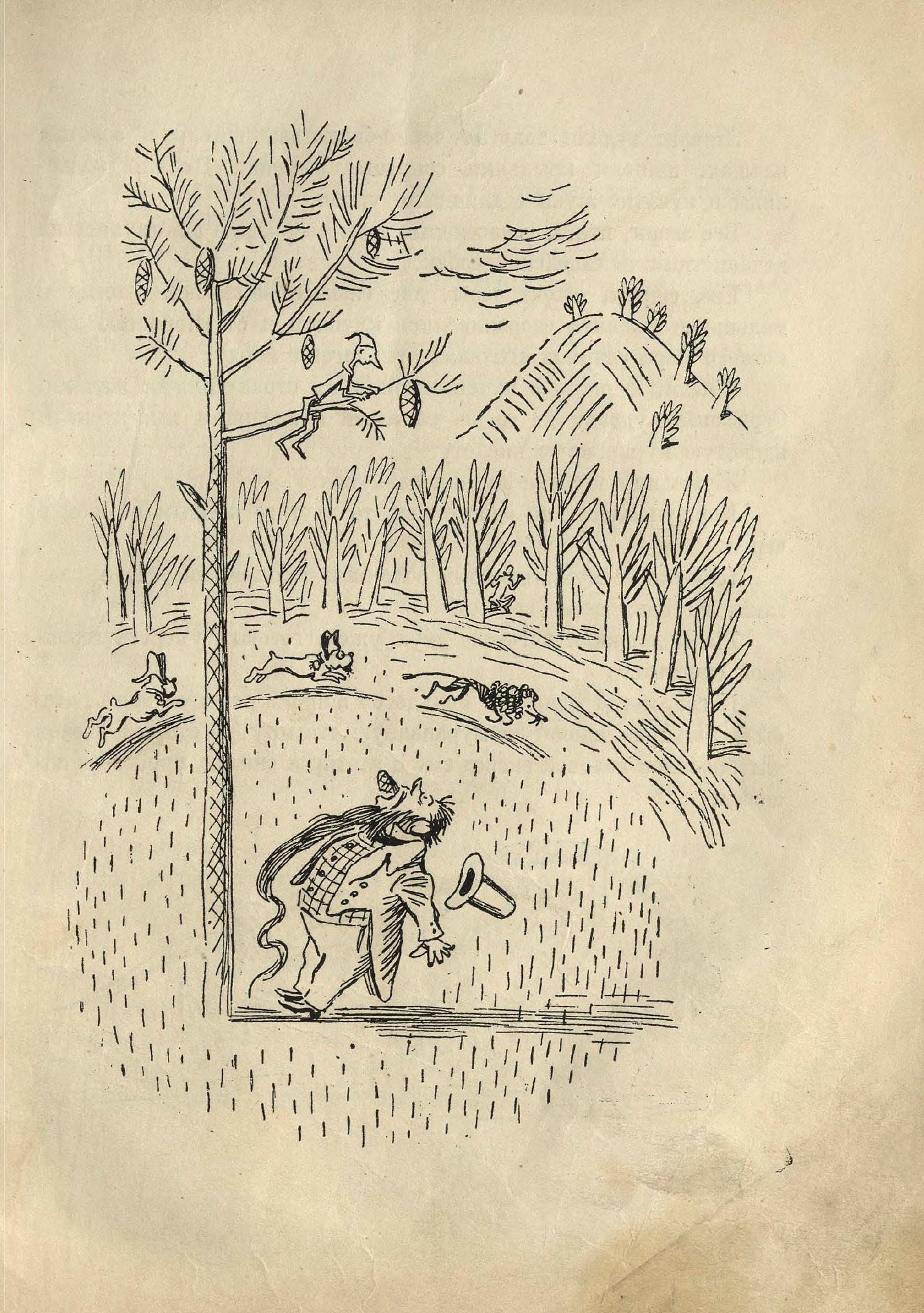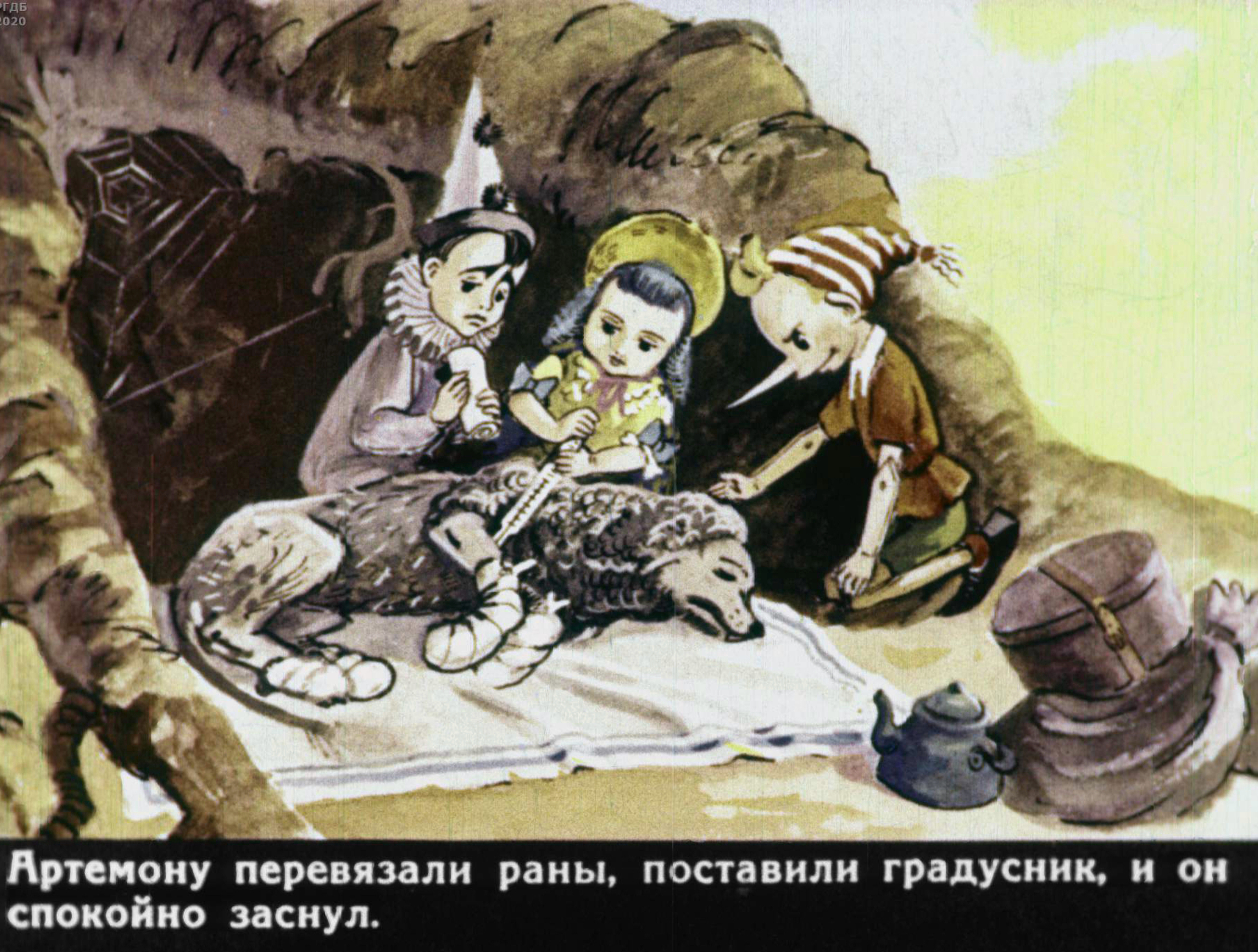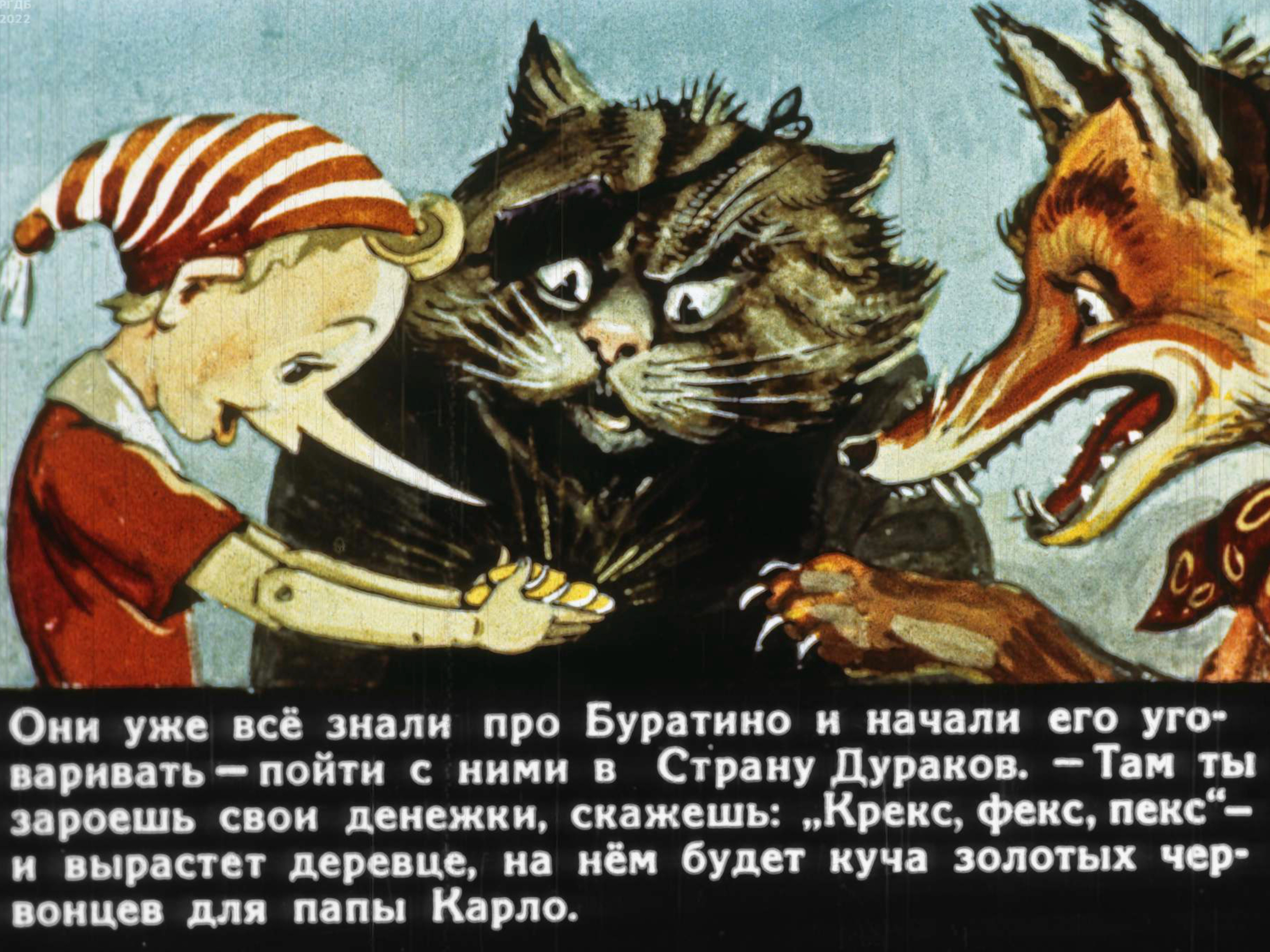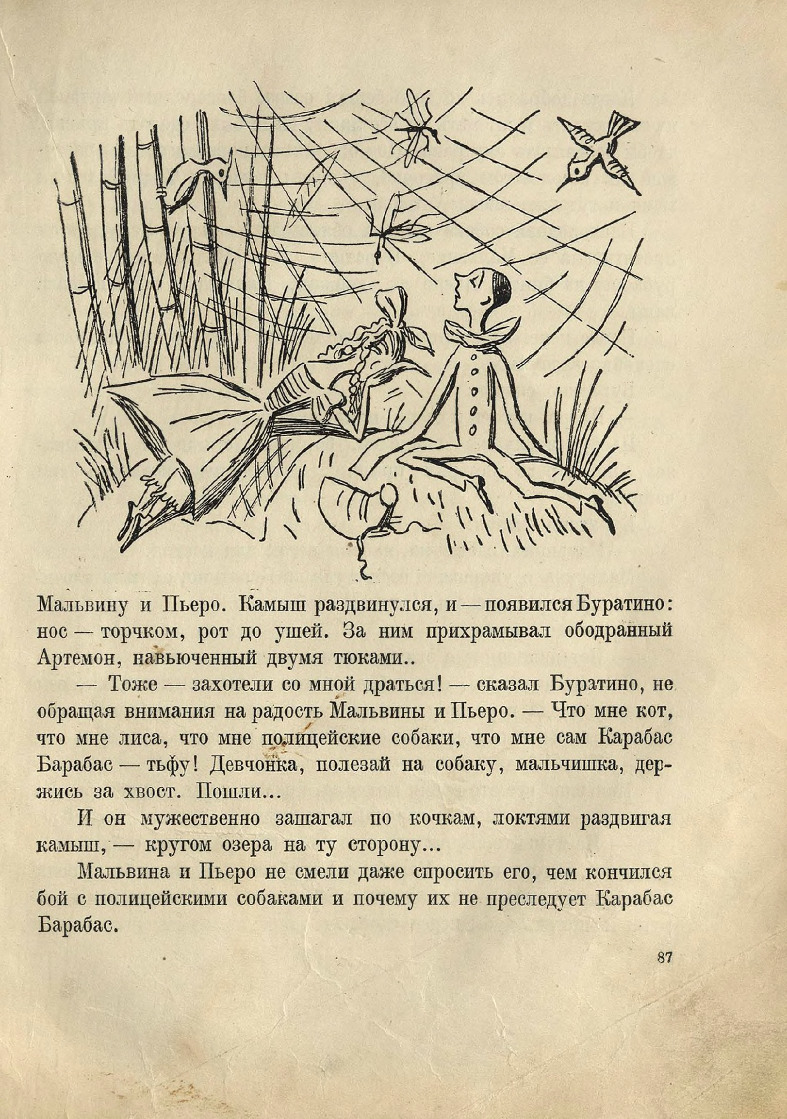 По дороге к пруду спускалась тележка; ее тащили две худые, как скелеты, овцы с ободранной шерстью. На козлах сидел жирный кот, с надутыми щеками, в золотых очках, — он служил при губернаторе тайным нашептывателем в ухо. Позади него — важный Лис, губернатор… На узлах лежали Мальвина, Пьеро и весь забинтованный Артемон, — всегда такой расчесанный хвост его волочился кисточкой по пыли. Позади тележки шли два сыщика — добермана-пинчера.
