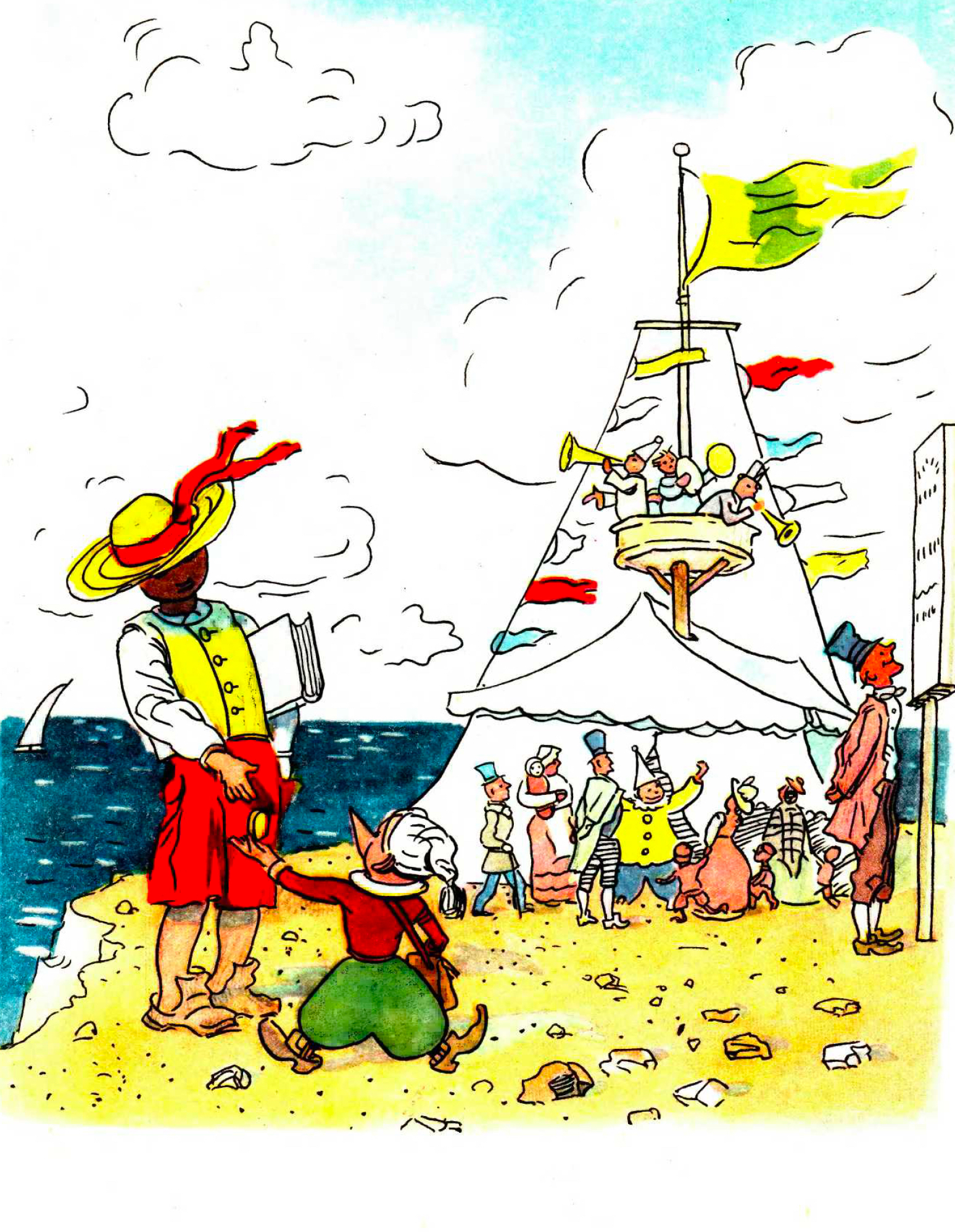 Не знаю, как современные мамочки обходят эту проблему (есть которые замазывают отдельные слова в книге). Но для иллюстратора персонаж-алкоголик — это вызов. В 1936 году Малаховский вызова не убоялся — вот он, Джузеппе, который неподходящего, может и не пил, а вот подходящего с утра-то выпил: