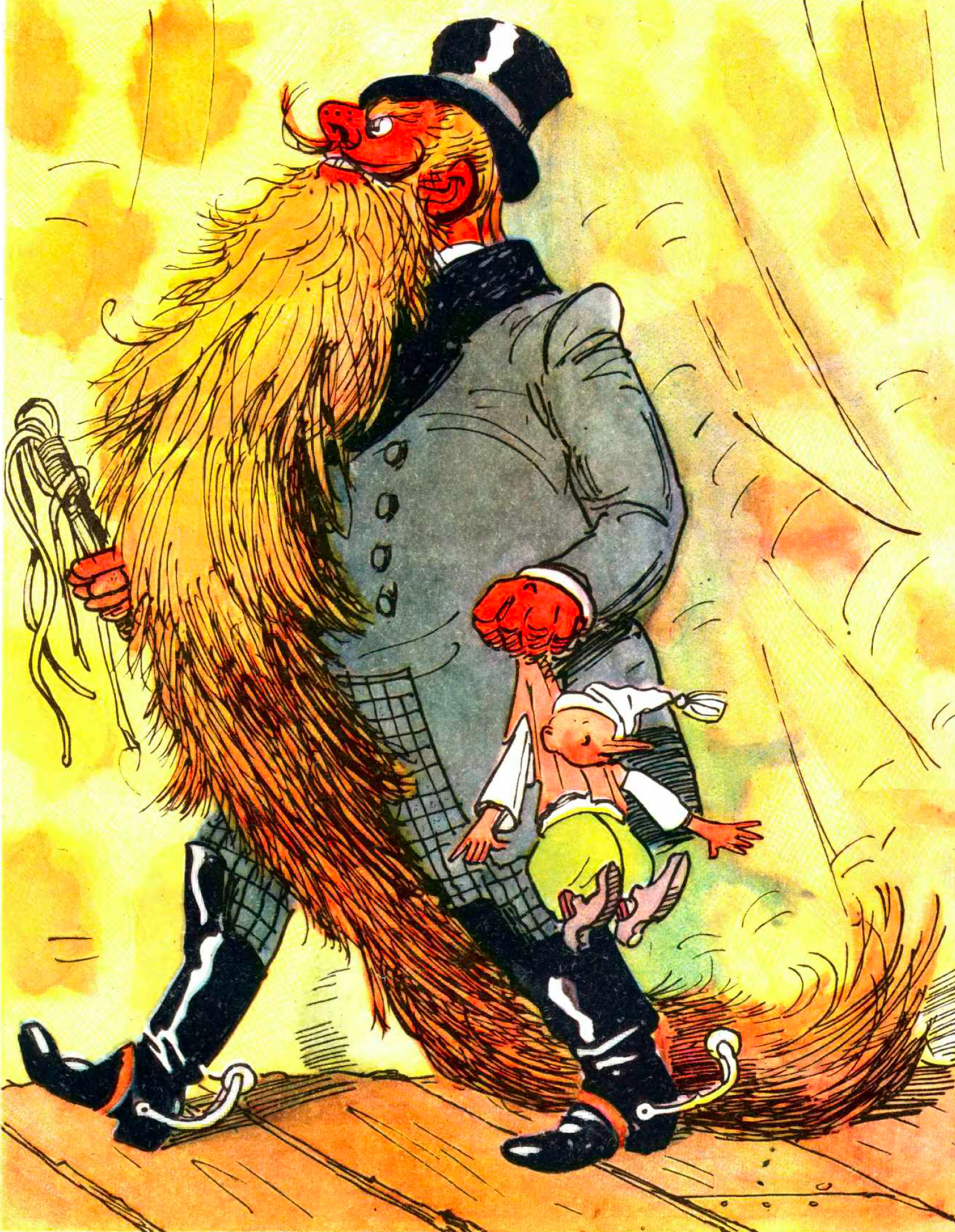 Карабас пришёл пресмыкаться перед Начальником Города. Карабас очень неуклюж и опять-таки растерян. Сейчас на коленях начнёт ползать, но разве ж это ползанье будет подобострастным? Так, на пузе покрутится. Далеко ему до Карабаса, которого Каневский нарисовал.