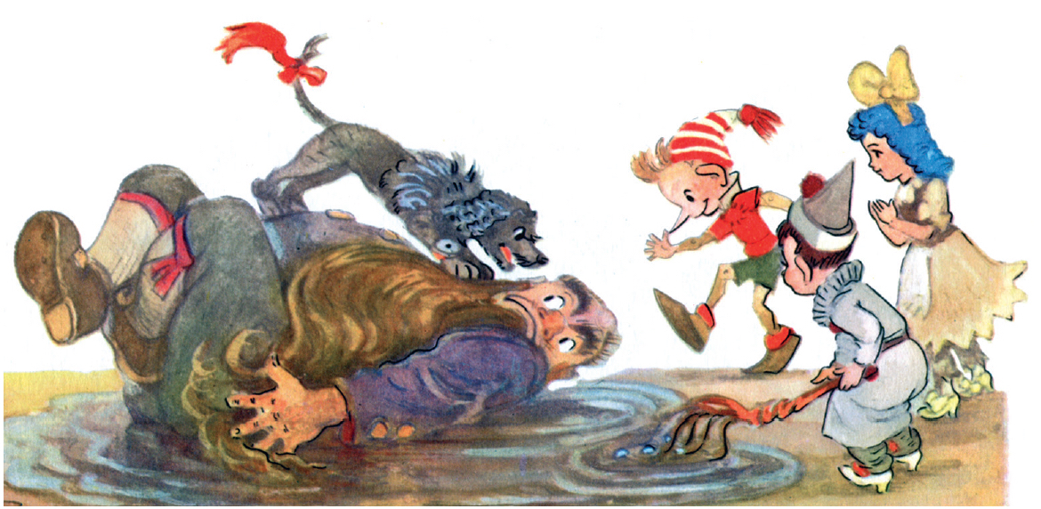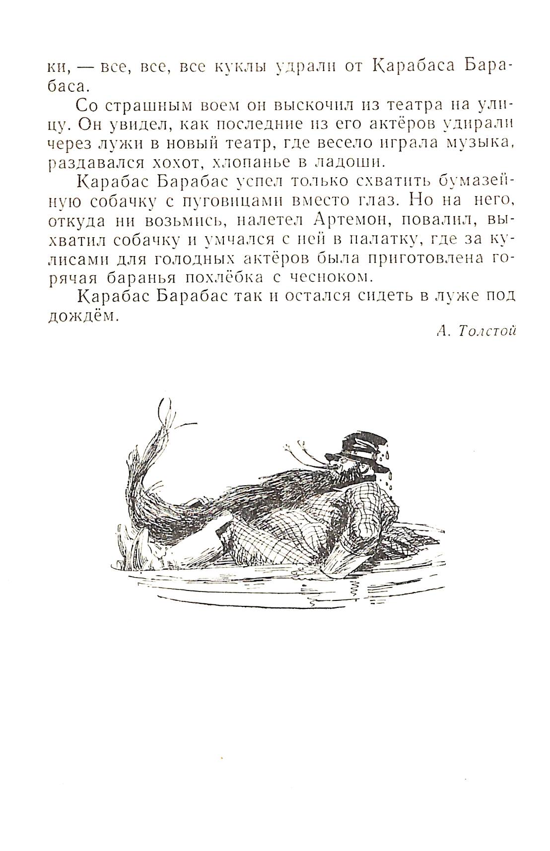 Последняя строка книги: "Карабас Барабас так и остался сидеть в луже под дождём". Художники часто соглашаются, что это самая эффектная концовка.