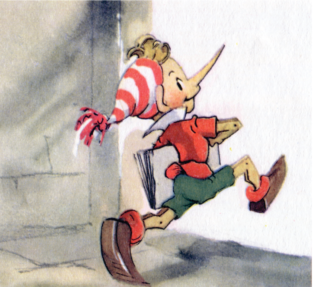 Малаховский рисует для Буратино нос большой и острый, но не тонкий и не самый длинный. У карикатуриста такой нос мог бы быть у человека, причём это даже не было бы гипертрофированным искажением обычного носа — так чуть-чуть крупноват. Учтём: Малаховский рисует деревянного человечка максимально близко к человеческому облику. Длинный-длинный тонкий нос Буратино не был предопределён изначально в иллюстрациях к "Золотому ключику".