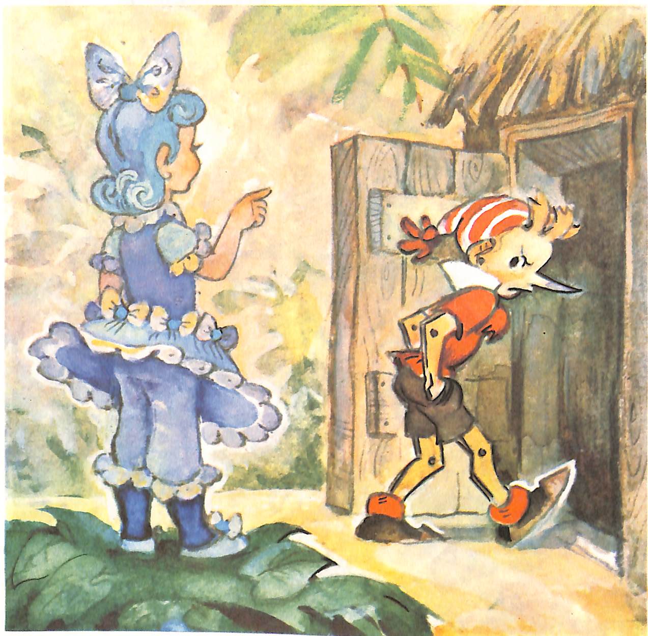 Фасона одежды толком не разглядеть, но можно видеть фигуру Буратино — тонкие жёрдочки. Здесь Муратов солидарен с Малаховским: Буратино не коренастый супергерой, а нервный испуганный ребёнок.
