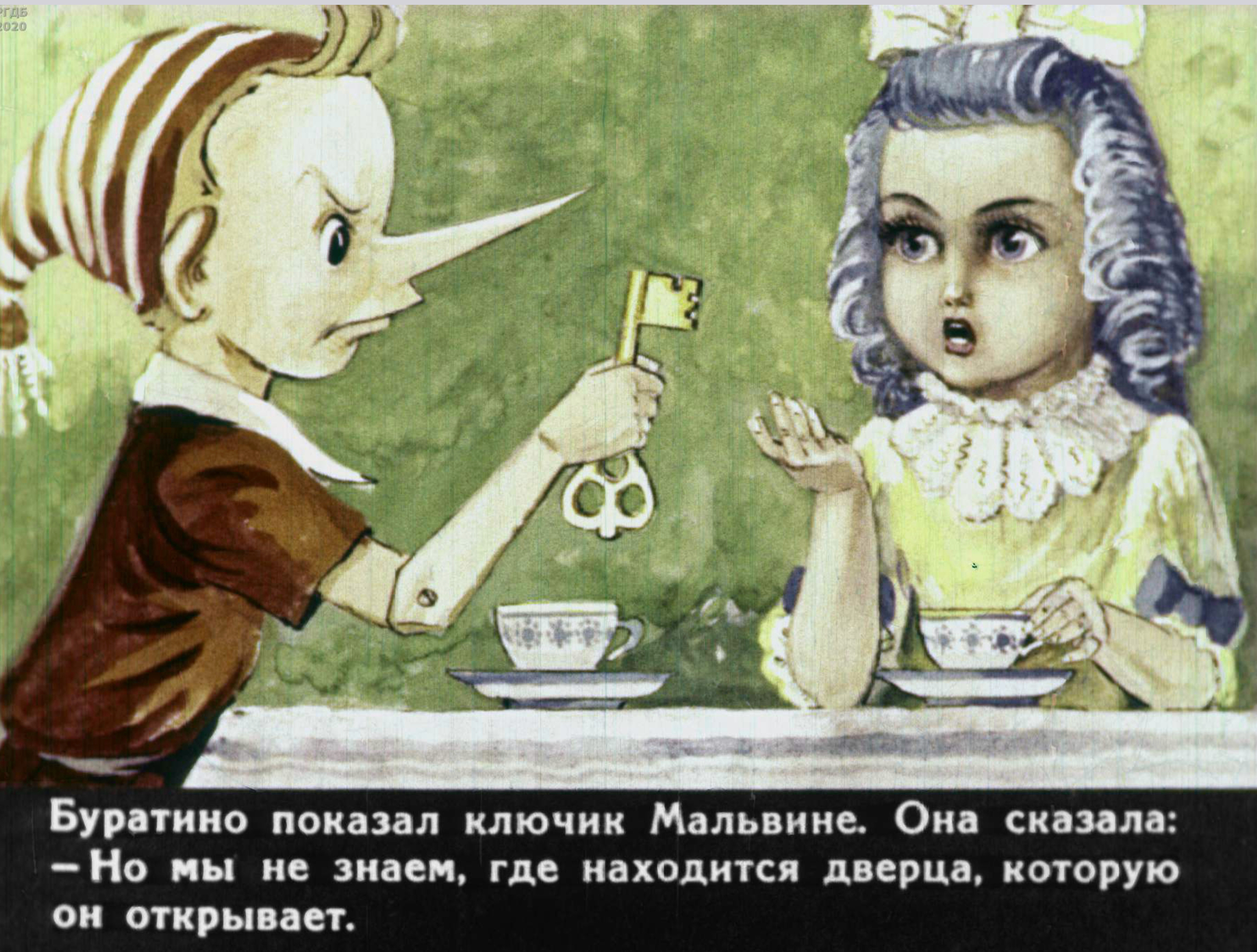 Мне всегда казалось, что в "Золотом ключике" были поздние иллюстрации Каневского — годов шестидесятых, "оттепельные". Но оказалось, что чёрно-белые иллюстрации Каневского вышли, по данным Фантлаба, как минимум в 1943 году, а цветная сюита была опубликована уже в 1950 году, в самый строгий период сталинского ампира.