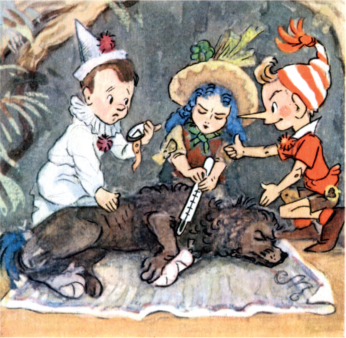 6) Лекаря вокруг постели Буратино, оказавшегося в гостях у Мальвины. Не могу пройти мимо этого эпизода (изменения рисунка в последующих вариантах незначительны).