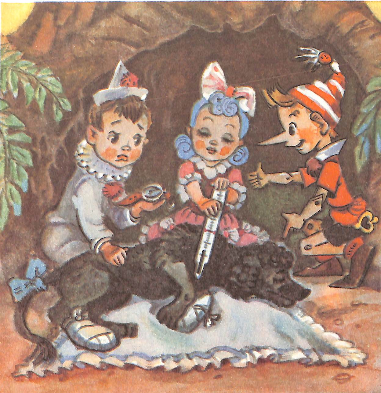 2) Открытка как живописное полотно (1955 г.). Многофигурная тщательно продуманная композиция. Карабас такой же, как в диафильме, только сапоги сменил на бальные чулки и туфли.