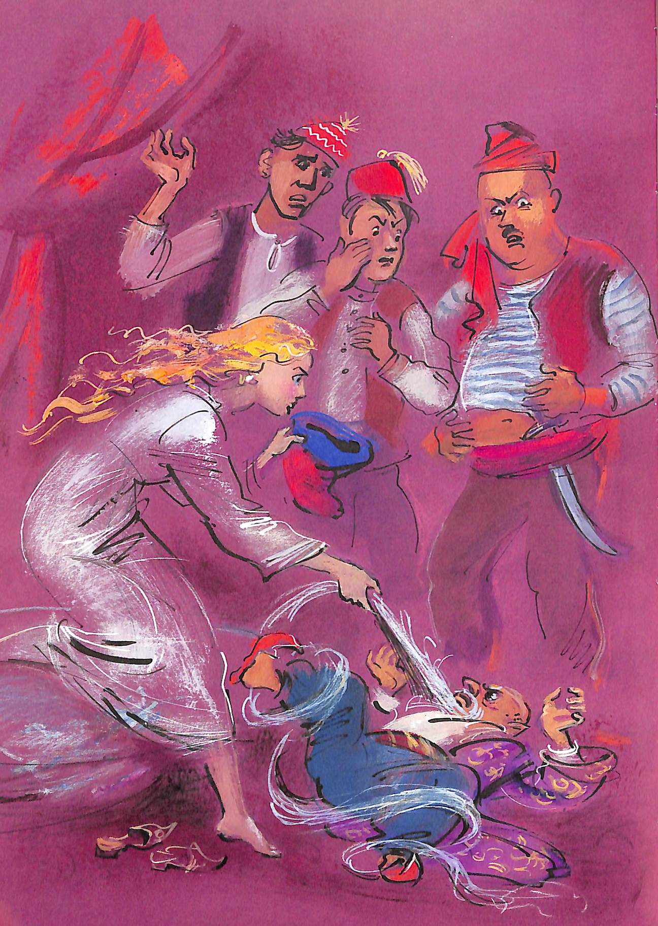 В зрелом возрасте Пушкин сказки писал со всей серьёзностью. Художница тоже ответственно подошла к иллюстрированию "Сказки о золотом петушке": Шамаханская царица всерьёз собралась обольщать престарелого царя.
