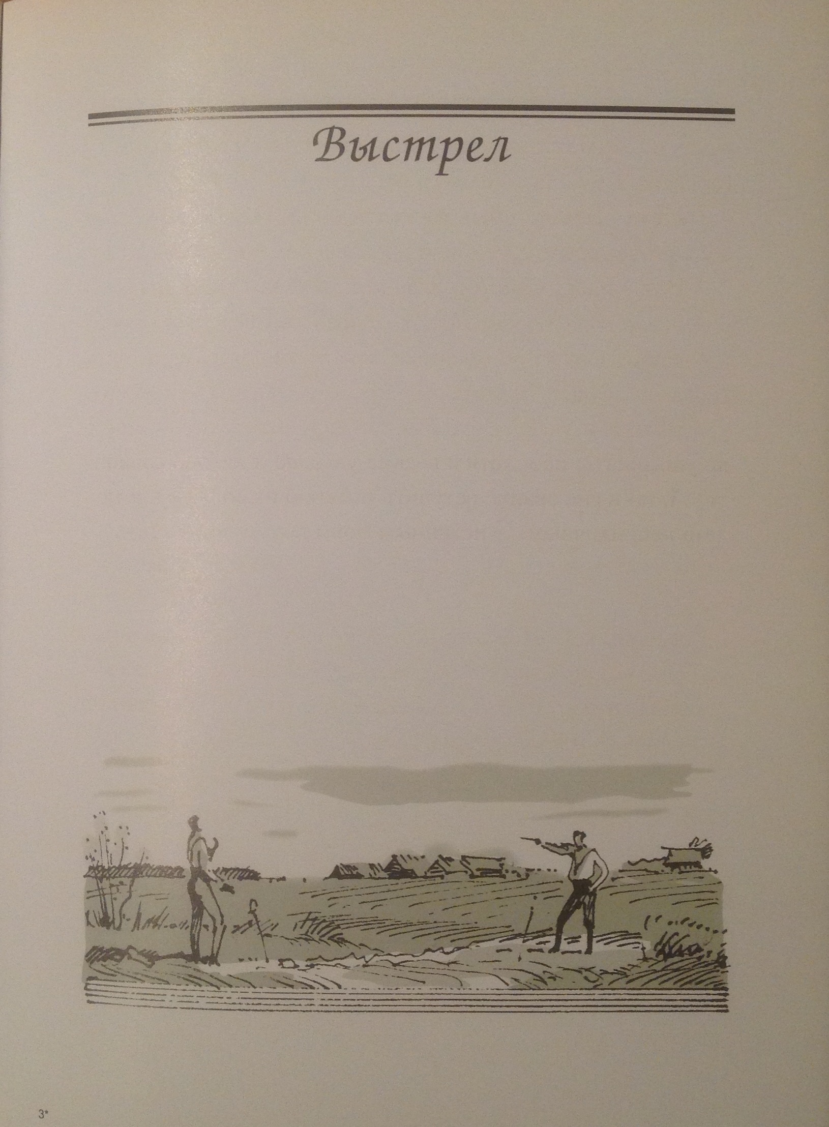 Очень правильный шмуцтитул как вводная иллюстрация: информатор Белкина в гостях у графа Б. на фоне простреленной картины. Акцентирует сложную структуру этой повести и не содержит спойлеров.