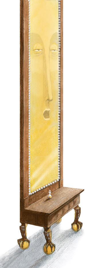 1) Злая и красивая королева-мачеха перед волшебным зеркалом. В наши дни мы больше смотрим на плавно изломанные линии, характеризующие стиль модерн. Это чад от свечей и подставка под зеркало с фигурой эмбриона тролля.