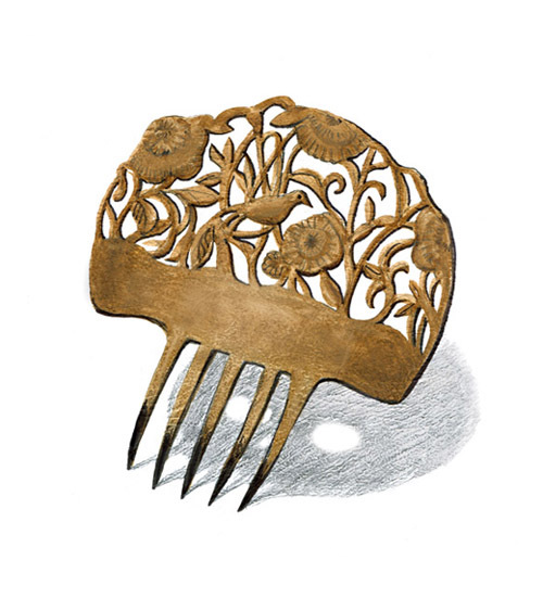 ...и орудия преступления — гребень и яблоко. Не удержалась художница, бросила зрителям понятный символ: тень от гребня образует череп. Зрители польщены: они разгадали смысл, чувствуют себя умными, тщательно разглядывают яблоко — ищут и там послание от художницы.
