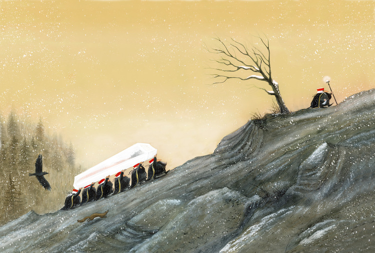 В каноническом тексте сказки, напомню, к гробу Белоснежки слетаются сова, ворон и голубок. Какие-то птичьи силуэты на рисунке есть. Но в первую очередь в глаза бросаются отсутствующие в тексте звери у гроба: заяц (кролик?), белка и олень. Это явно диснеевские мотивы (мультик я не смотрел, но больше не на кого подумать) — олень в мультике, видать, не был убит, а как-то чудесно спасся. Вот так и издавайся в США: заставят под свой менталитет сказку перерисовывать.