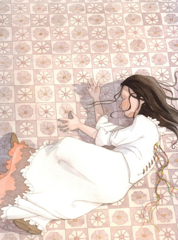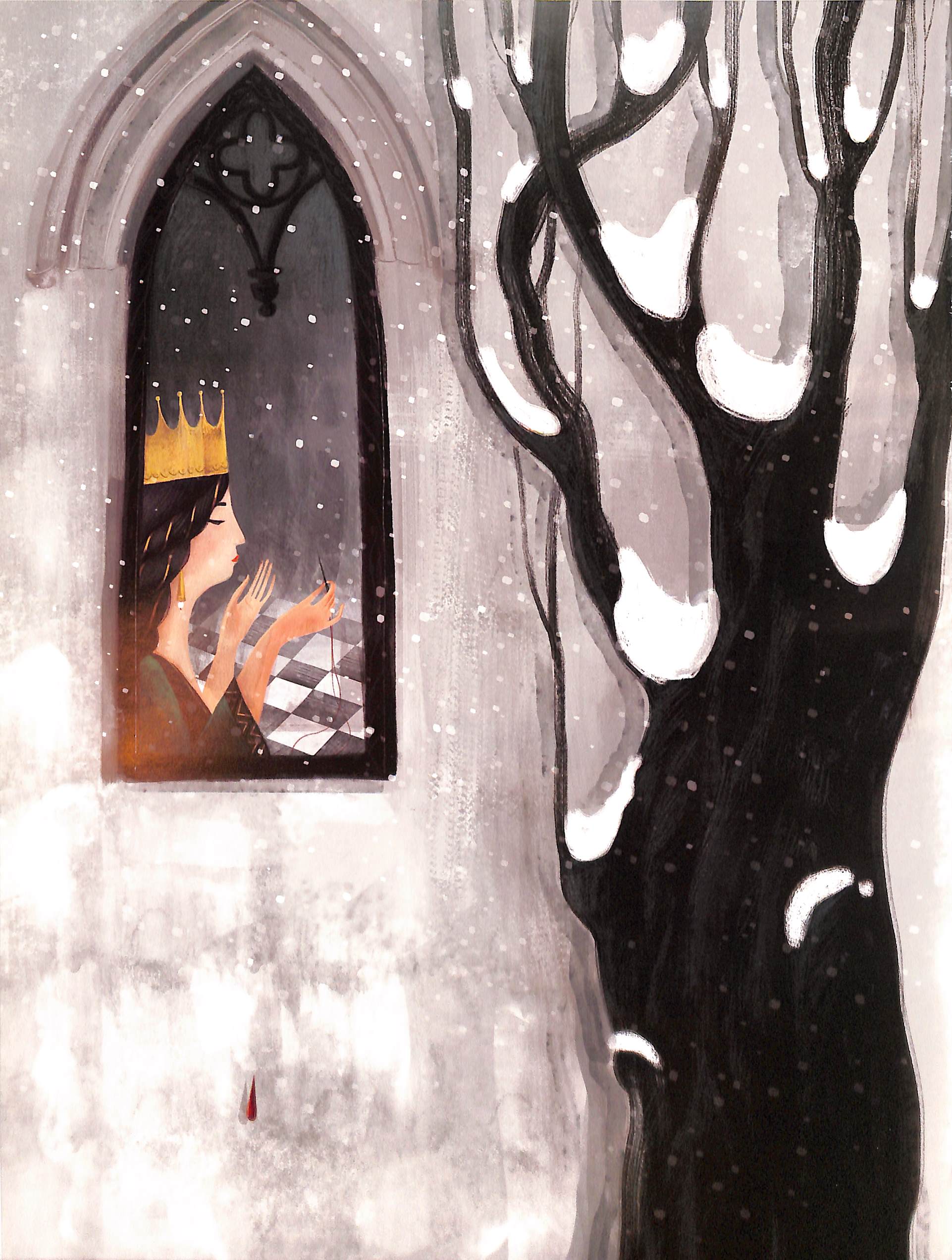 У художницы современная манера рисунка. Вот шмуцтитул к "Белоснежке". Платье, на которое как на экран спроецирована сцена из сказки. Приём, который любят использовать итальянские близняшки Бальбюссо (в давнем обзоре они у нас были — см. в самом конце) — но художница в дальнейшем этим приёмом не злоупотребляет.