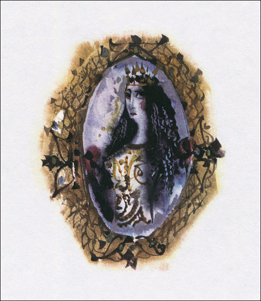Художница владеет стилем магического реализма. Вот они — две королевы: мать и мачеха. Один женский тип. Понятно, что безутешный король в чужих глазах искал огонь угаснувших очей. Но у второй жены подбородок волевой, ведьминский.