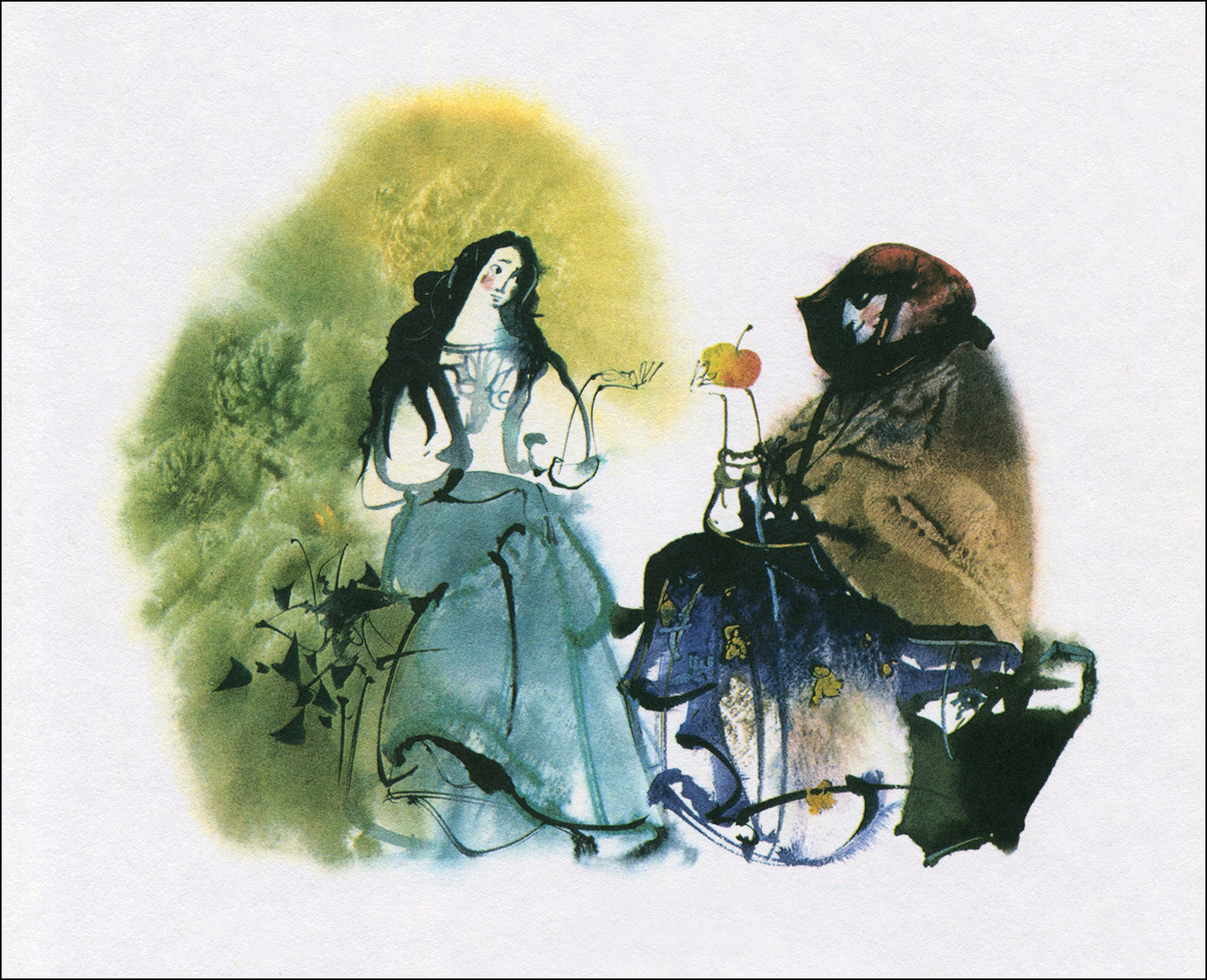3) Отравление яблоком (избранные иллюстрации). Видно, что у ведьмы-старушки, действительно, пустые глаза (бельмы) — нагоняет жути без всяких специальных эффектов.