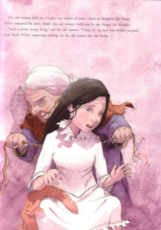 1) Удушение шнуром — повествовательная иллюстрация, показано само действие, а не настроение. Художница вложила много страсти в этот эпизод. Королева-мачеха на заднем плане — с искажённым лицом.