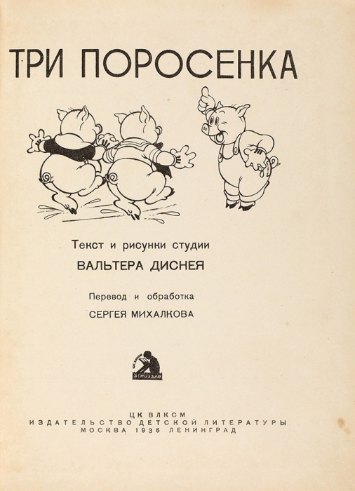 "Три поросёнка" — это старая английская сказка. В России она частенько издаётся в сборниках британского фольклора. Последние десятилетия "Три поросёнка" Михалкова печатаются с подзаголовком "По английской сказке". Это не так. Отличия сюжета михалковского рассказа от сюжета английской сказки вроде бы и незначительные, но для русского читателя существенные. А дело в том, что непосредственным образцом для Михалкова выступила не английская сказка, а довоенный мультфильм Диснея. Первое издание отдельной книжки имело подзаголовок: «Текст и рисунки студии У.Диснея. Перевод и обработка Сергея Михалкова». — М.-Л., 1936 (в 1937 году было уже третье издание с теми же атрибутами). Понятно, что отказ в подзаголовках от американского поп-культурного источника "Трёх поросят" в пользу английского народного фольклора был неизбежен уже во второй половине 1940-х гг.
