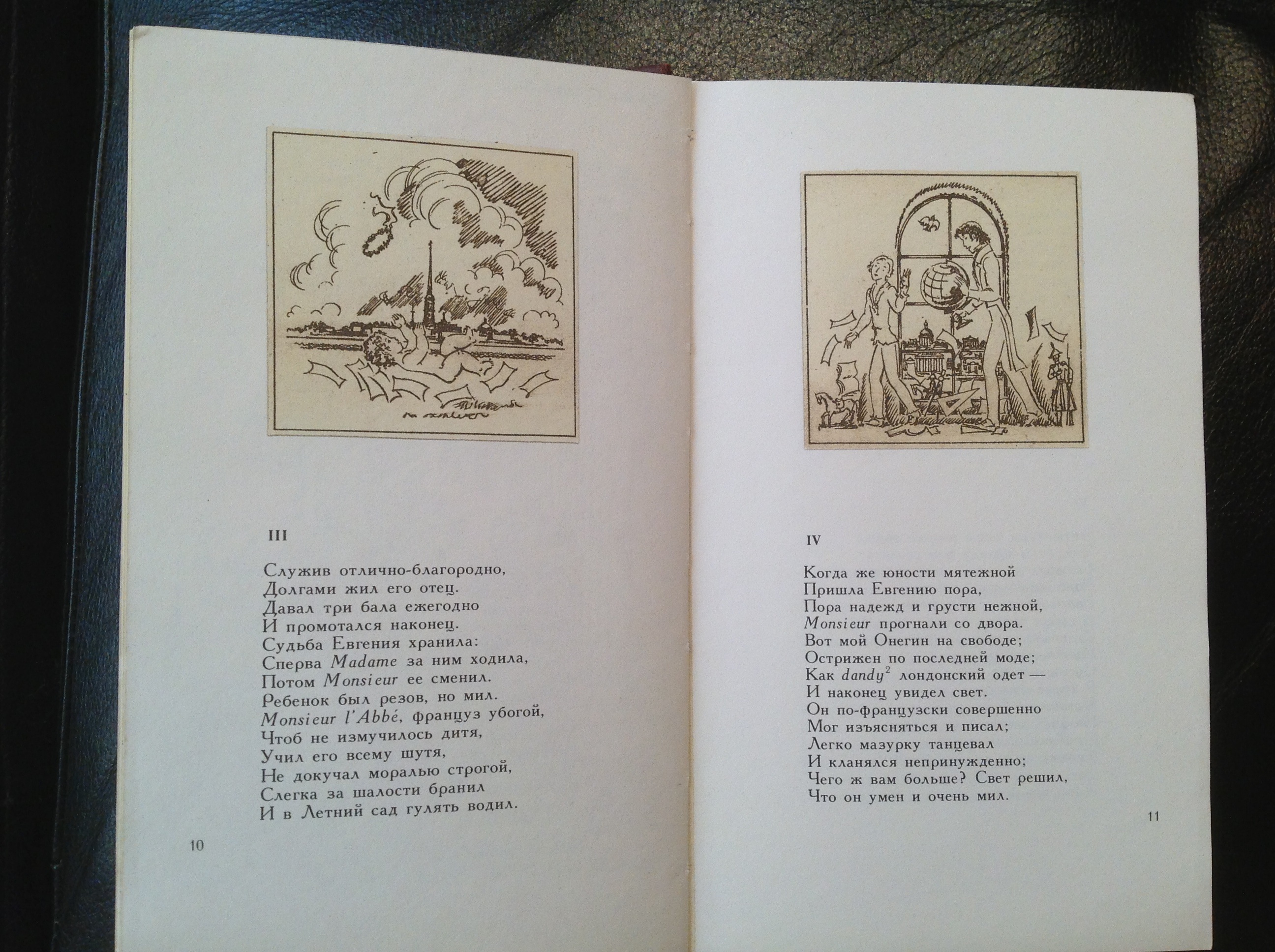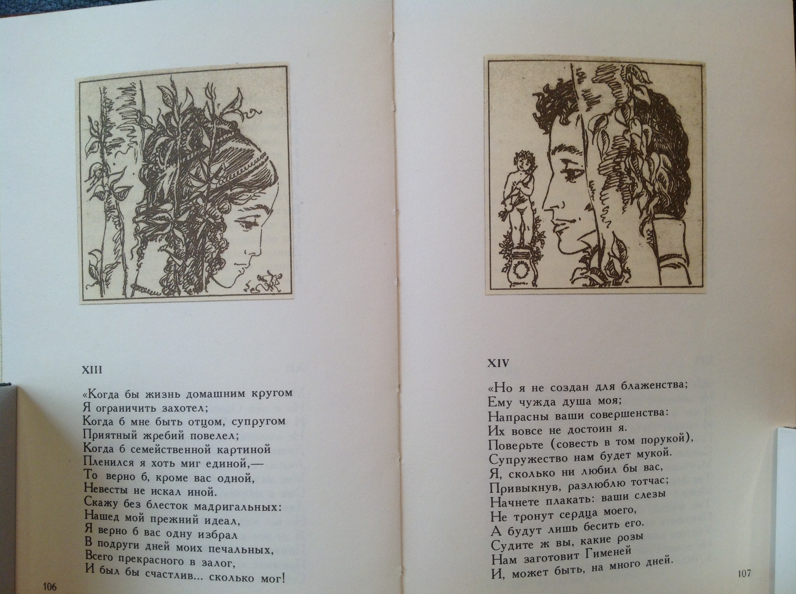 Иллюстрации внутри (при узнаваемой руке мастера) оказались неправдоподобно убогими по концепции (качество-то печати — бог с ним! тогда ещё не избалованы были). Макет имеется. Но собственно по сюжету "Онегина" ничего нет, одни только пушкинские портреты (в основном, открывающие главы).