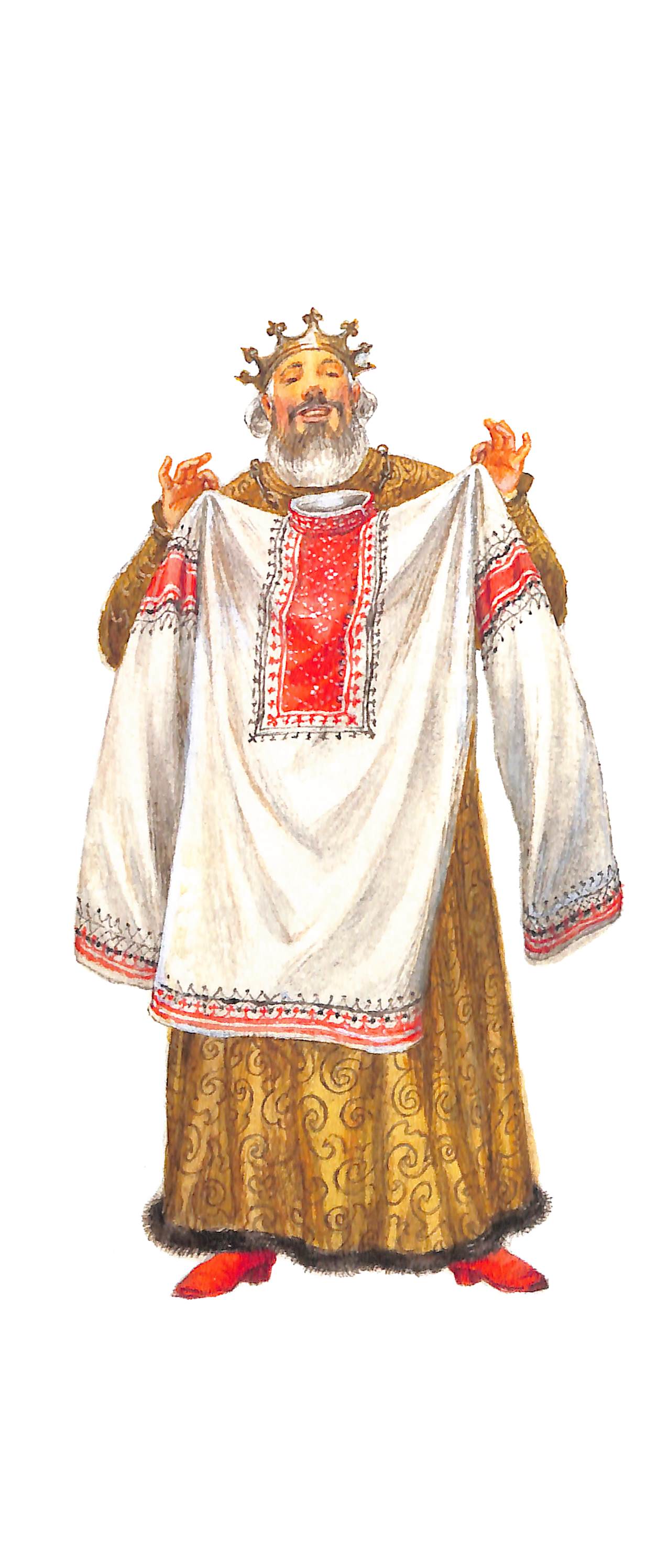3) Но не зря Рачёв рисовал стольких животных в одежде. Он смог тонко передать и черты животных в человеке. Настоящая удача — это образ Василисы Премудрой в человеческом облике. В её одежде (в головном уборе, особенно) и фигуре есть что-то лягушачье.