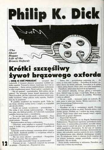2. И новая встреча с американским писателем Филипом Диком. Рассказ, который называется в оригинале “The Short Happy Life of the Brown Oxford” (1954, “The Magazine of Fantasy and Science Fiction”, Jan.; 1954, “The Magazine of Fantasy and Science Fiction” [UK], № 9; 1985, авт. сб. “I Hope i Shall Arrive Soon”), перевела на польский язык под названием “Krótki szczęśliwy żywot brązowego oxforda/Короткая счастливая жизнь коричневого оксфорда” АННА КЕЙНА/Anna Kejna (12-16). Иллюстрации ПЕТРА ПУЦЕКА/Piotr Pucek.