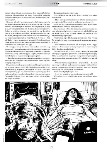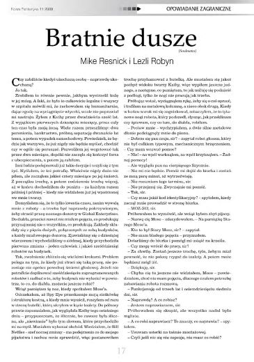 11.1. Рассказ, который в оригинале называется “Soulmates” (2009, “Asimov’s Science Fiction”, Sept.; 2016, авт. сб. “Soulmates”) написали в соавторстве американский писатель Майк Резник/Mike Resnick и австралийская писательница Лесли Робин/Lezli Robyn. Его перевела на польский язык под названием “Bratnie dusze/Братские души” ЭЛЬЖБЕТА ГЕПФЕРТ/Elżbieta Gepfert (стр. 17—28). Иллюстрации РАФАЛА ШЛАПЫ/Rafał Szłapa. И это девятнадцатое появление писателя с художественным произведением в нашем журнале (см. тэг «Резник М.») и первое – австралийской писательницы.