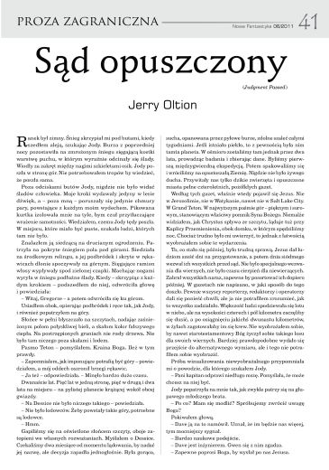 16.1. Рассказ американского писателя Джерри Олшена (Jerry Oltion), который в оригинале носит название “Judgement Passed” (2008, ант. “Wastelands: Stories of the Apocalypse”), перевел на польский язык под названием “Sąd opuszczony” («Отвергнутый Страшный суд») БЛАЖЕЙ КУБАЦКИЙ/Błaźej Kubacki (стр. 41—52). Иллюстрации МАРЦИНА КУЛАКОВСКОГО/Marcin Kułakowski.