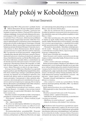 12.2. Рассказ американского писателя Майкла Суэнвика/Michael Swanwick, который носит в оригинале название “Little Room in Koboltdown” (2007, “Asimow’s Science Fiction”, Apr.-May; 2007, авт. сб. “The Dog Said Bow-Wow”), перевела на польский язык под названием “Mały pokój w Koboltdown/Маленький гостиничный номер в Кобольтдаун” ГАБРИЭЛЯ СЕНЯВСКАЯ/Gabriela Sieniawska (стр. 17—22). Иллюстрации ЯРОСЛАВА МУСЯЛА/Jarosław Musiał.