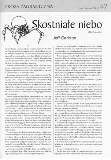 17.2. Рассказ (скорее повесть) американского писателя Джеффа Карлсона//Jeff Carlson, который называется в оригинале “The Frozen Sky” (2007, ант. “L. Ron Habbard Prezents Writers of the Futture. Vol. XXIII), перевел на польский язык под названием “Skostniale niebo/Окостеневшее небо” ГЖЕГОЖ КОМЕРСКИЙ/Grzegorz Komerski (стр. 47—64). Иллюстрации ЯРОСЛАВА МУСЯЛА/Jarosław Musiał. Позже повесть была переписана и расширена до размеров одноименного романа.
