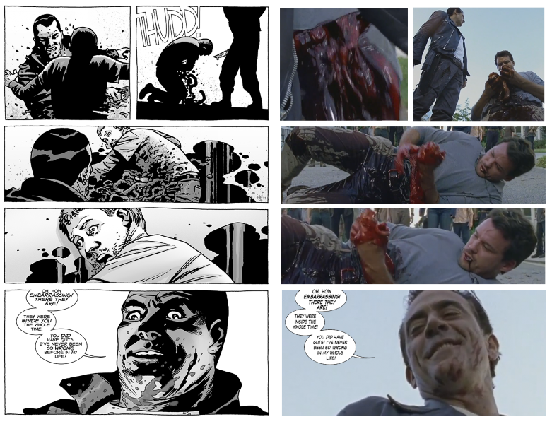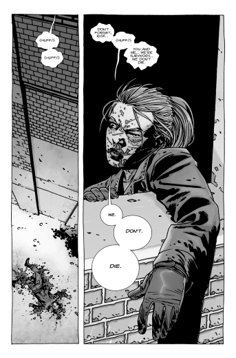 Давайте представим себе нашу обычную жизнь. Мы живем себе, живем и вдруг впадём в кому. После месячного пребывания в больнице открываем глаза и обнаруживаем, что того мира, который мы знали, больше не существует. Вокруг бродят голодные и разлагающиеся мертвецы, и мы хватаем дробовик и отправляемся наводить с его помощью порядок. Нет. У Киркмана первое чувство, которое появляется, — это шок, затем следует сомнение, страх, а затем горе. Есть еще цель, определяющая действия. И это не желание раскрыть тайну появления зомби, а попытка найти семью и обеспечить себе выживание. Поэтому на первый план выходят живые люди и ситуации, с которыми им придется столкнуться в новой, жестокой реальности, ведь живые мертвецы, несмотря на свою медлительность, так же опасны, как и голодные львы. Сценарист ни в чем не щадит своих героев, последовательно создавая им ад на земле. Неустанные нападения, смерть, увечья, зловоние, стресс и страх – это те проблемы, с которыми каждый день приходится сталкиваться товарищам по несчастью. Беда в том, что все это исходит не только от зомби. Пока одни люди пытаются обрести счастье и покой, другие пользуются новыми обстоятельствами для того, чтобы дать волю жестокости, отклонениям, безумию и жадности. Все как будто изменилось, но это осталось прежним.