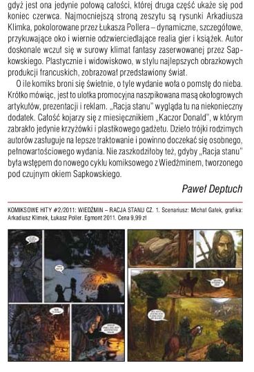 Если комикс великолепно сам себя защищает, то его издание взывает к небесам о мести. Короче говоря, это рекламная листовка, битком набитая множеством околоигорных статей, презентаций и реклам. Собственно комикс выглядит здесь ненужной добавкой. В целом этот номер журнала очень похож на номер ежемесячника “Donald Duck”, ему только кроссворда и пластмассовой игрушки не хватает. Продукт творения трех отечественных авторов заслуживает лучшего обращения и должен дождаться особого, полноценного издания. Не помешало бы, если бы «Соображения государственного порядка» стали введением в новый комиксный цикл, посвященный Ведьмаку и создаваемый под бдительным оком Сапковского.