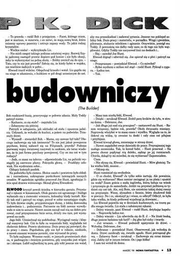 2. Рассказ американского писателя Филипа Дика, который называется в оригинале “Builder” (1953, “Amazing Stories”, Jan.; 1955, 1980, авт. сб. “A Handful of Darkness”), перевела на польский язык под названием “Budowniczy/Строитель” АННА КЕЙНА/Anna Kejna (12-16). Иллюстрации МАРТЫ КШИВИЦКОЙ/Marta Krzywicka.