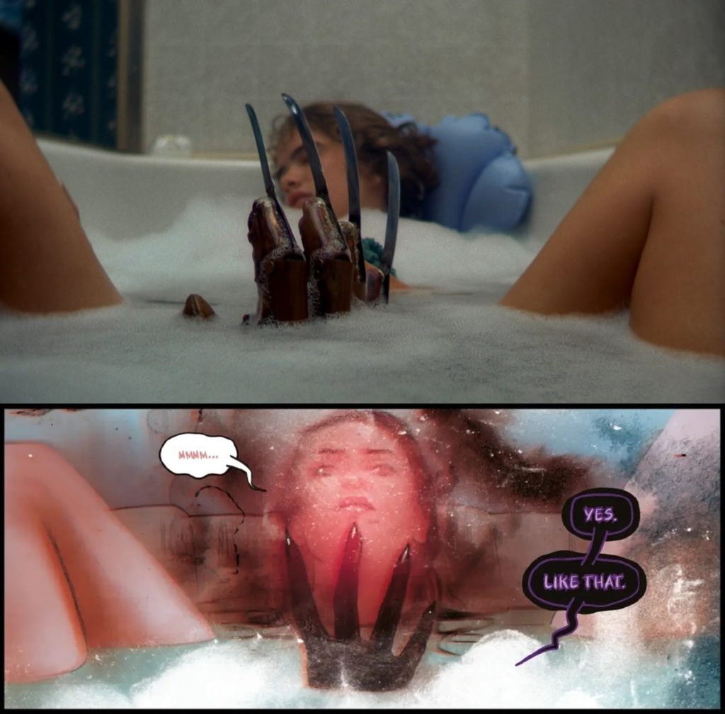 Вверху: «Кошмар на улице Вязов» Уэса Крейвена (“A Nightmare on Elm Street, 1984, Wes Crawen).