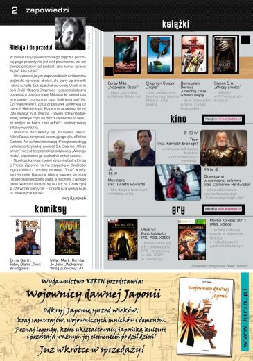 1. Под заголовком “Анонсы” (“Zapowiedzi”) напечатан список книжных, кино и комиксных премьер, его комментирует Ежи Жимовский (стр. 2).