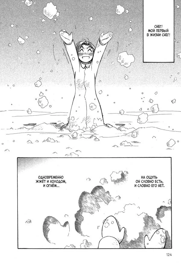 Тем не менее ждать ответов на все вопросы от «Иокогамы» не стоит — какого-либо связанного сюжета в манге нет. О мире мы тоже скорее догадываемся, как и о причине создания андроидов. Иногда герои пытаются копнуть чуть глубже, но обычно это ни к чему конкретному не приводит, а добытые сведения в лучшем случае отрывочны. Жизнь Альфы — история без начала и конца, которая тем не менее легко погружает в свою атмосферу и создаёт ощущение умиротворяющего потока. Но если вы любите, чтобы всё было объяснено и разложено по полочкам, то можете в конце поймать неприятное чувство неудовлетворённости.
