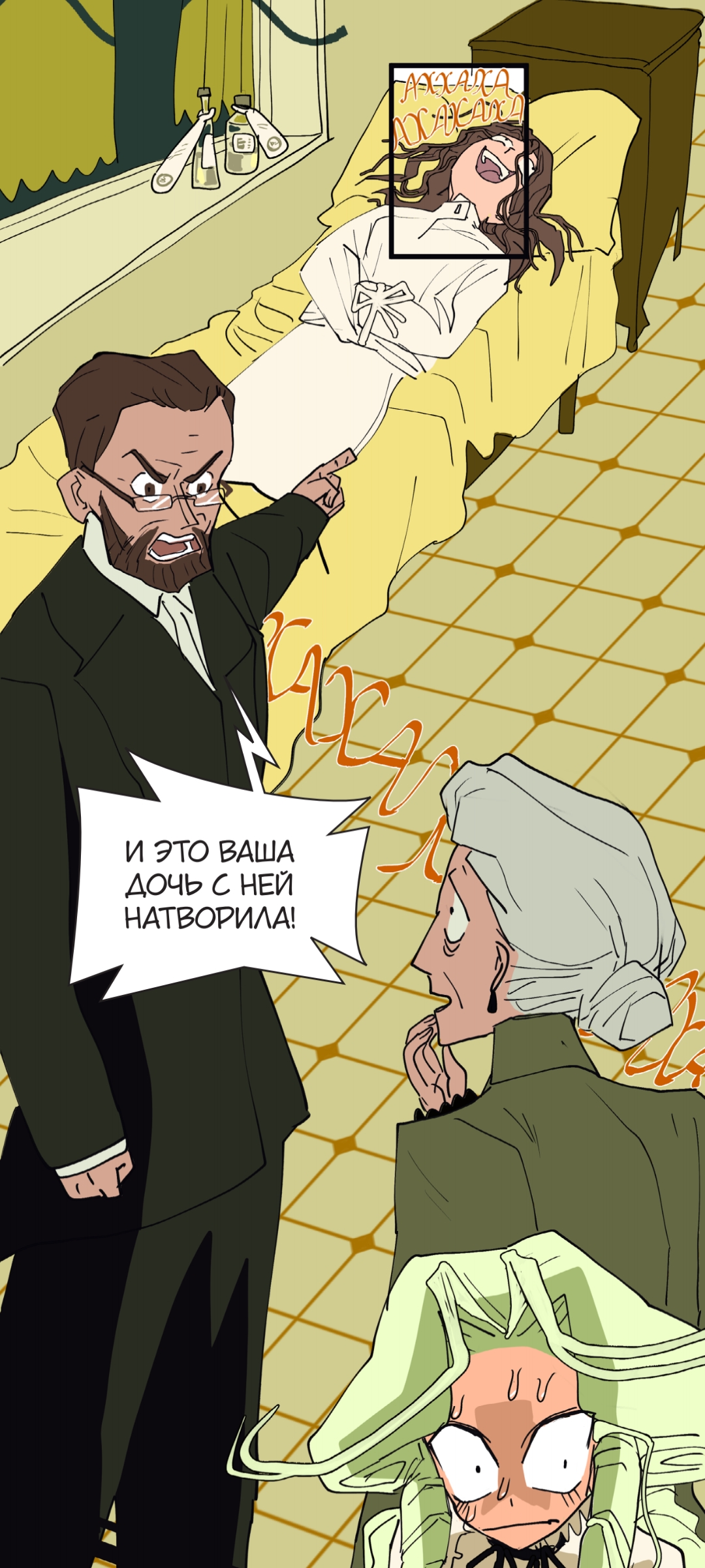 Действие комикса ради разнообразия происходит в Петербурге начала XX века, где всё в той или иной мере дышит родными осинами. Евгения умело работает с историческими реалиями, наполняя кадры комикса не просто известными топонимами и узнаваемой архитектурой, но играясь даже с не самыми очевидными сторонами формата. Например, все звуки в комиксе выполнены на дореволюционном. Вроде мелочь, но тоже добавляет атмосферы. На неё же работает и сам рисунок. Все эти платья с оборочками, немного имперского шика и блеска, которые соседствуют с замогильной чертовщиной. При этом нельзя не отметить, что иллюстрации из-за специфического стиля всё же зайдут не всем, но для меня они получились восхитительными. Даже плоская заливка цветом здесь всегда получается в тему.