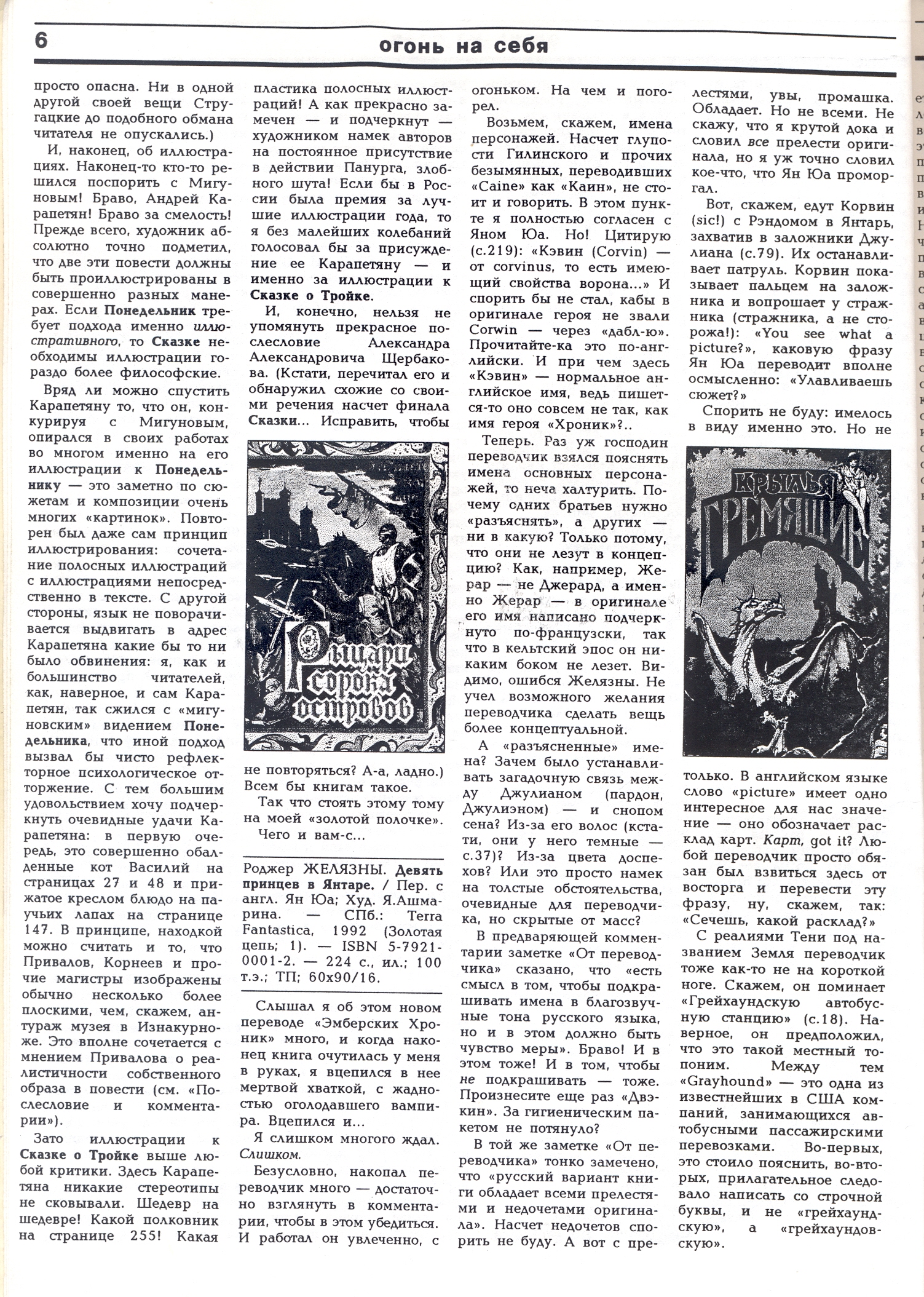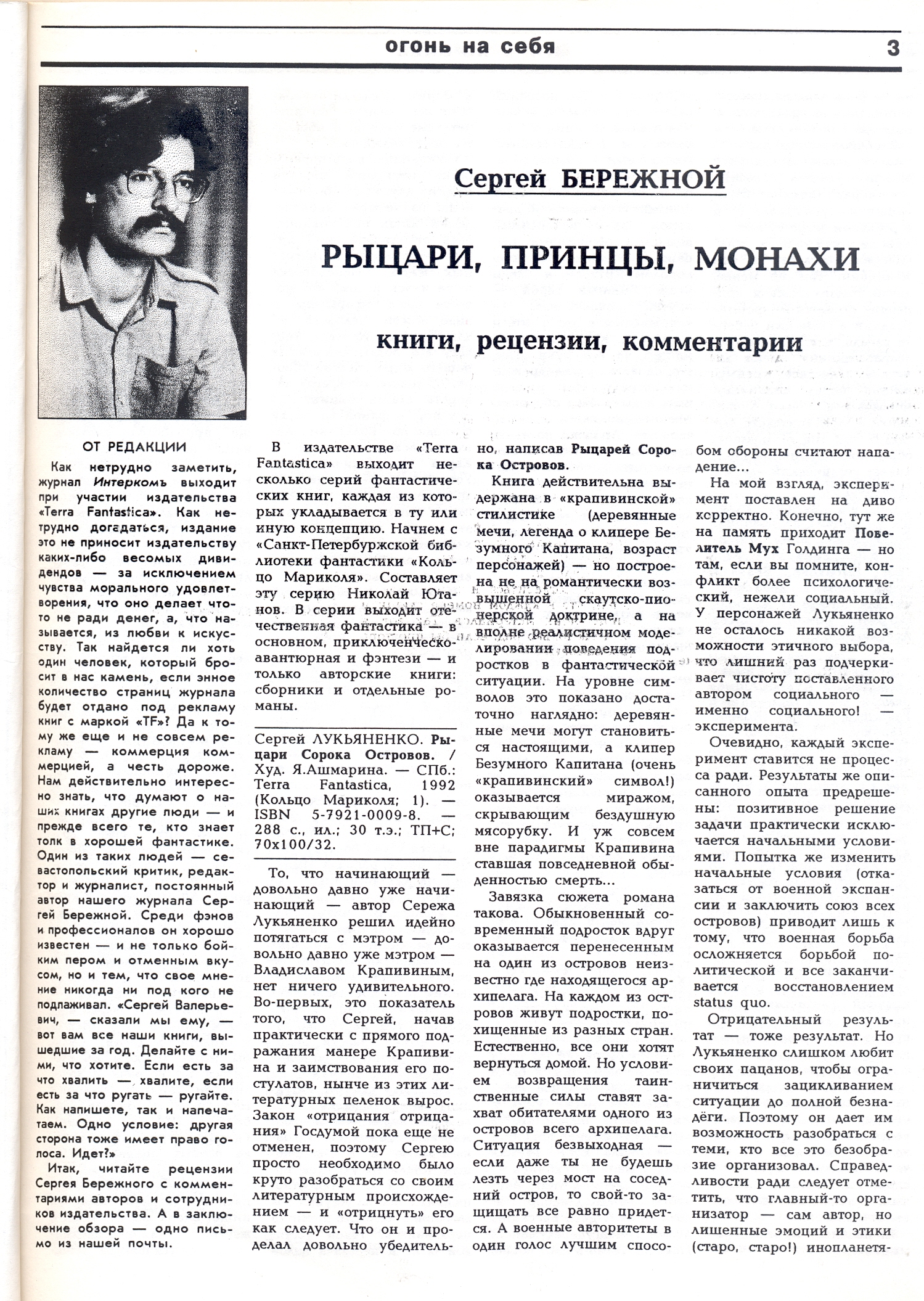 Две страницы этого номера "Интеркома" были посвящены Андрею Лазарчуку — только-только восходившей тогда звезде российской фантастики из сибирского города Красноярска. Первая страница — это небольшое интервью, которое взял у писателя мой альтер-эго А.Н.Деев (в основном, по поводу его сборника "Священный месяц Ринь" и повести "Иное небо"). А вторая страница из того же номера — это мини-эссе, которое наваял об Андрее Лазарчуке мой постоянный напарник по фэнзинёрским делам Сергей Бережной: