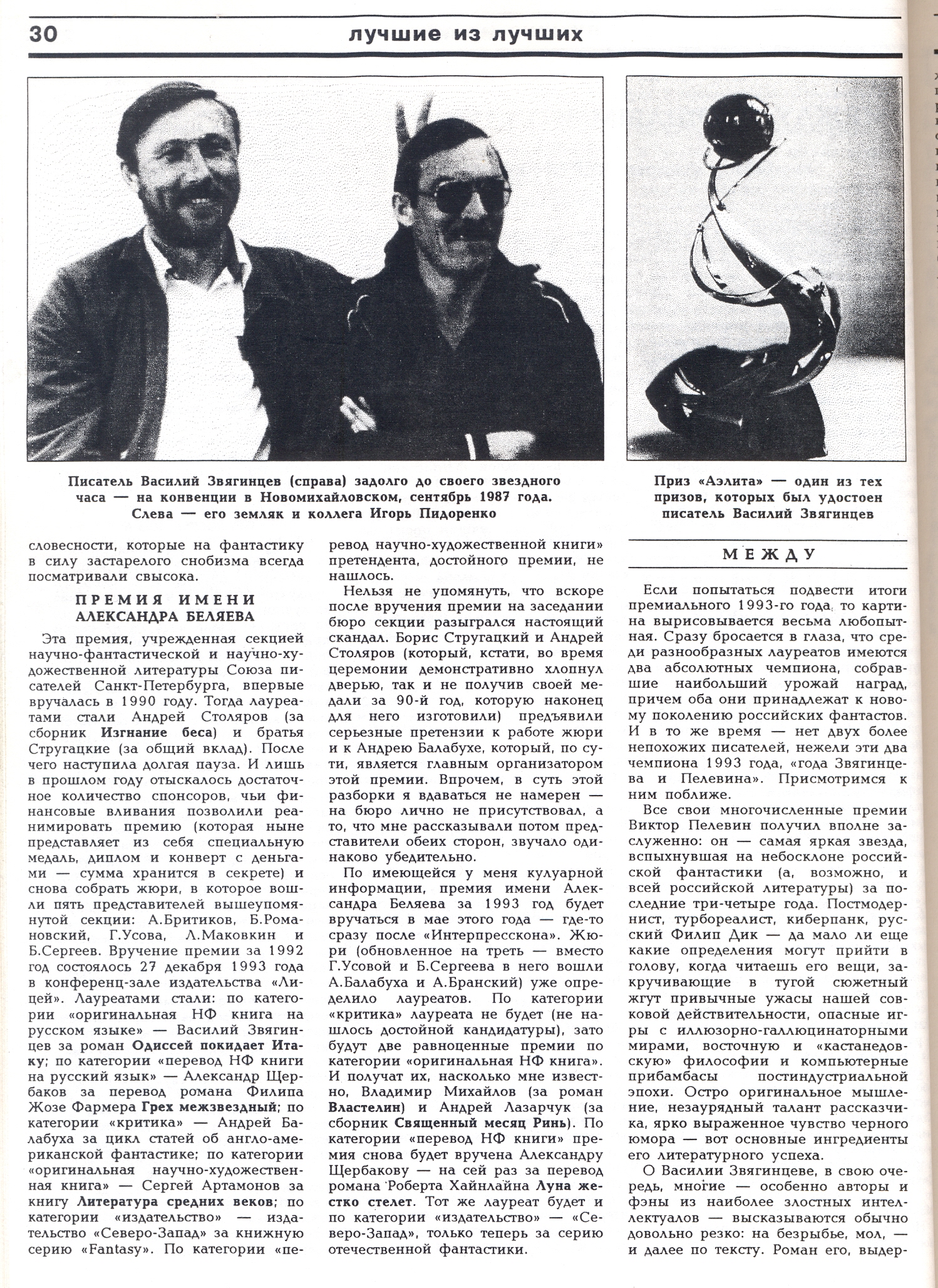 Это был, казалось бы, совершенно проходной материал — о лауреатах литературно-фантастических премий 1992-1993 годов и премиальные прикидки на наступивший 1994 год, — а ведь на самом деле именно тогда заваривались все те зубодробительные конфликты, которые сотрясали нашу фантастику всю вторую половину 90-х годов и даже далее. Достаточно вспомнить, например, весьма скандальное присуждение премии "Странник" на "Интерпрессконе" 1994 года, главными героями которого стали Андрей Столяров и Андрей Лазарчук. Правда, "Интеркомъ", прекративший своё существование как раз на данном номере, этот скандал уже не отслеживал — даже в своих достаточно скучных вкладках в журнале "Если" 1995 года (главред "Еслей" Александр Шалганов все эти писательско-фэновские разборки просто не понимал и на "жареную" информацию в своем журнале моментально наложил вето). Зато выпавшую из рук "Интеркома" свечу (вместе с канделябром) очень быстро подхватили Андрей Николаев и Сергей Бережной в своём пародийном фэнзине "Оберхам", молниеносно — всего через один номер — трансформировавшемся в весьма респектабельный журнал "Двести". А вот уж в "Двестях"-то литературные скандалы раздували как могли — никому мало не показалось. Кстати, могу предположить, что именно тот полувооруженный конфликт, разгоревшийся на "ИПК-94", в значительной степени и привёл к тому, что разозлившиеся московские фэны из клуба "Три парсека" создали в итоге свой "всесоюзный" конвент "РОСКОН" с соответствующими призами, которые, надо полагать, вручаются куда справедливее, чем "волюнтаристские" "Интерпресскон" и "Странник" (если кто не понял — тут табличка "сарказм"). Уж мне ли об этом не знать...)))