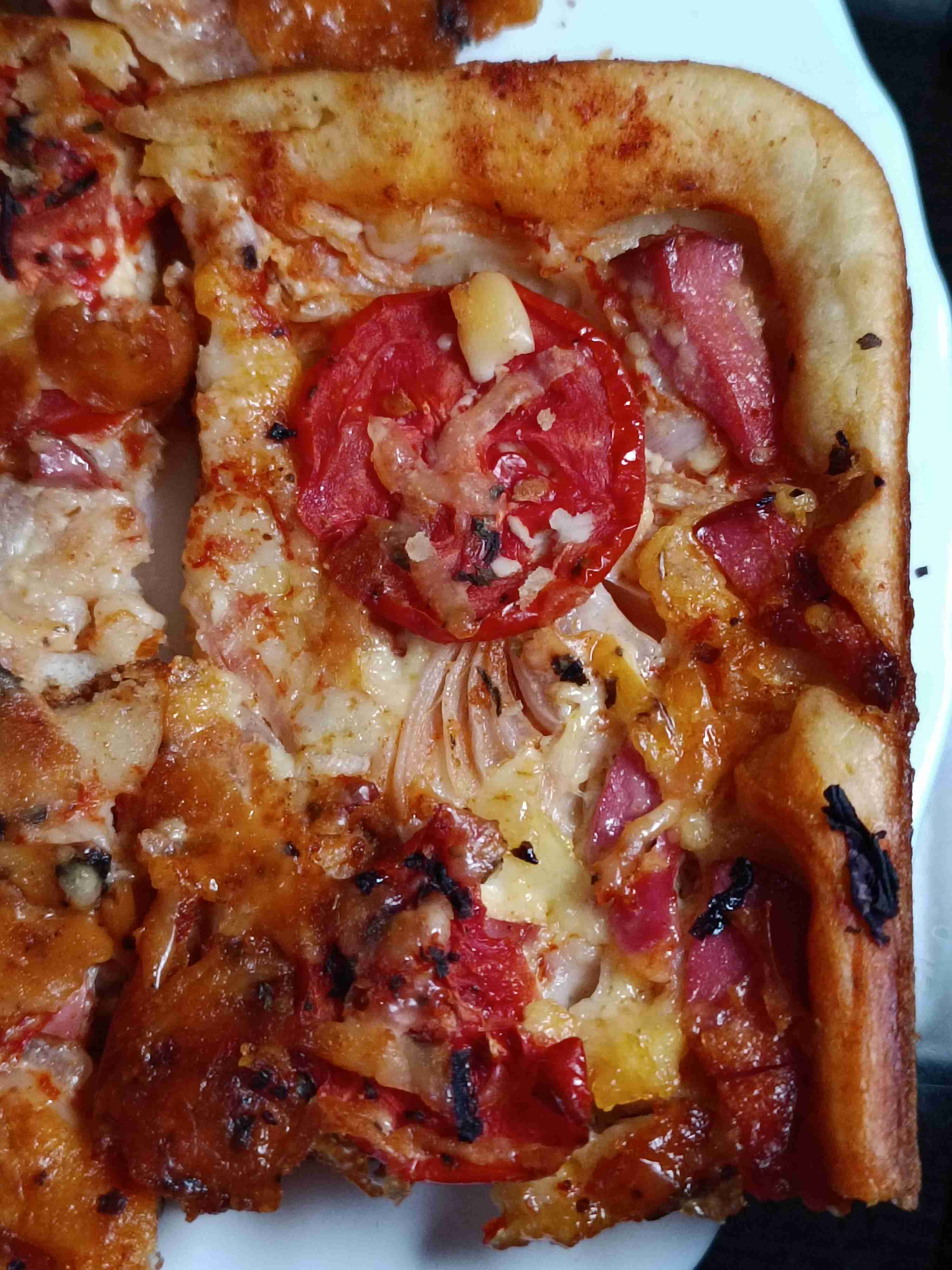 "Вчерашняя пицца к завтраку", потому что вчера вечером возникла мысль её состряпать. Из начинки только — три сосиски, три помидорки, три лука. Ну еще кое что — сыр, соус, майонез, приправы.