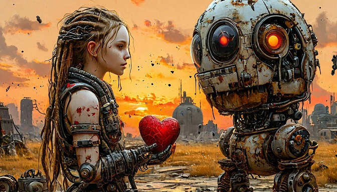 Мрачный мир будущего в стиле аниме. Последняя девушка-киборг собирает с дерева кровавые «яблочки» а из-за угла наблюдает робот из смешариков. Он конечно друг для девушки, но если та посмеет убежать с плантации, то милый робот отпилит ей руку или ногу. Вот это дружба, я понимаю. Тут правильно заметили, что рассказ напоминает Любовь, Смерть и Роботы по духу и концепции. Лучшая сцена в самом начале: механическая робо-рука сжимает сердце и кровь струится по железу и подшипникам. Как будто кадр из Терминатора.