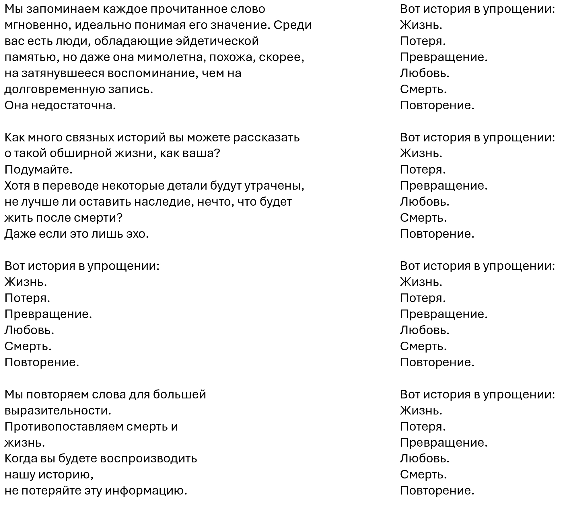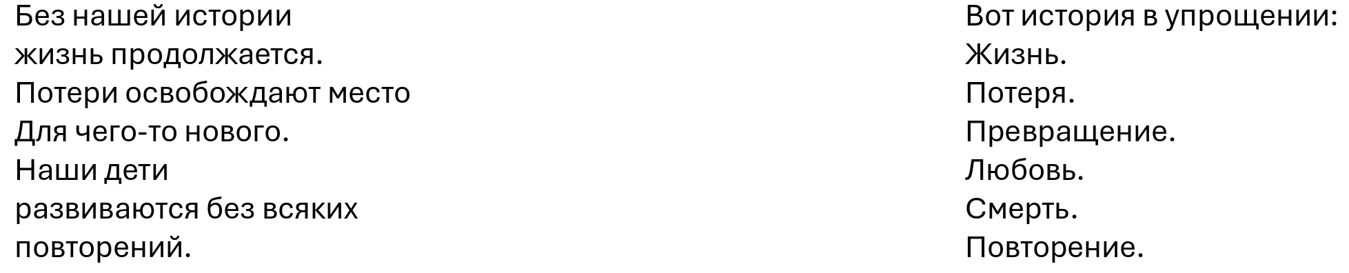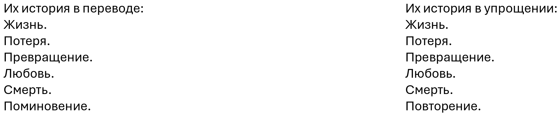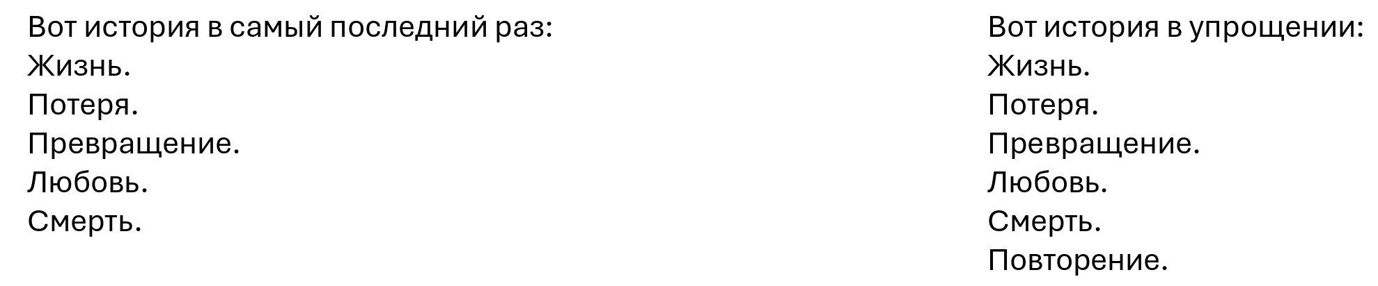 Вот история в упрощении: Жизнь. Потеря. Превращение. Любовь. Смерть. Повторение.