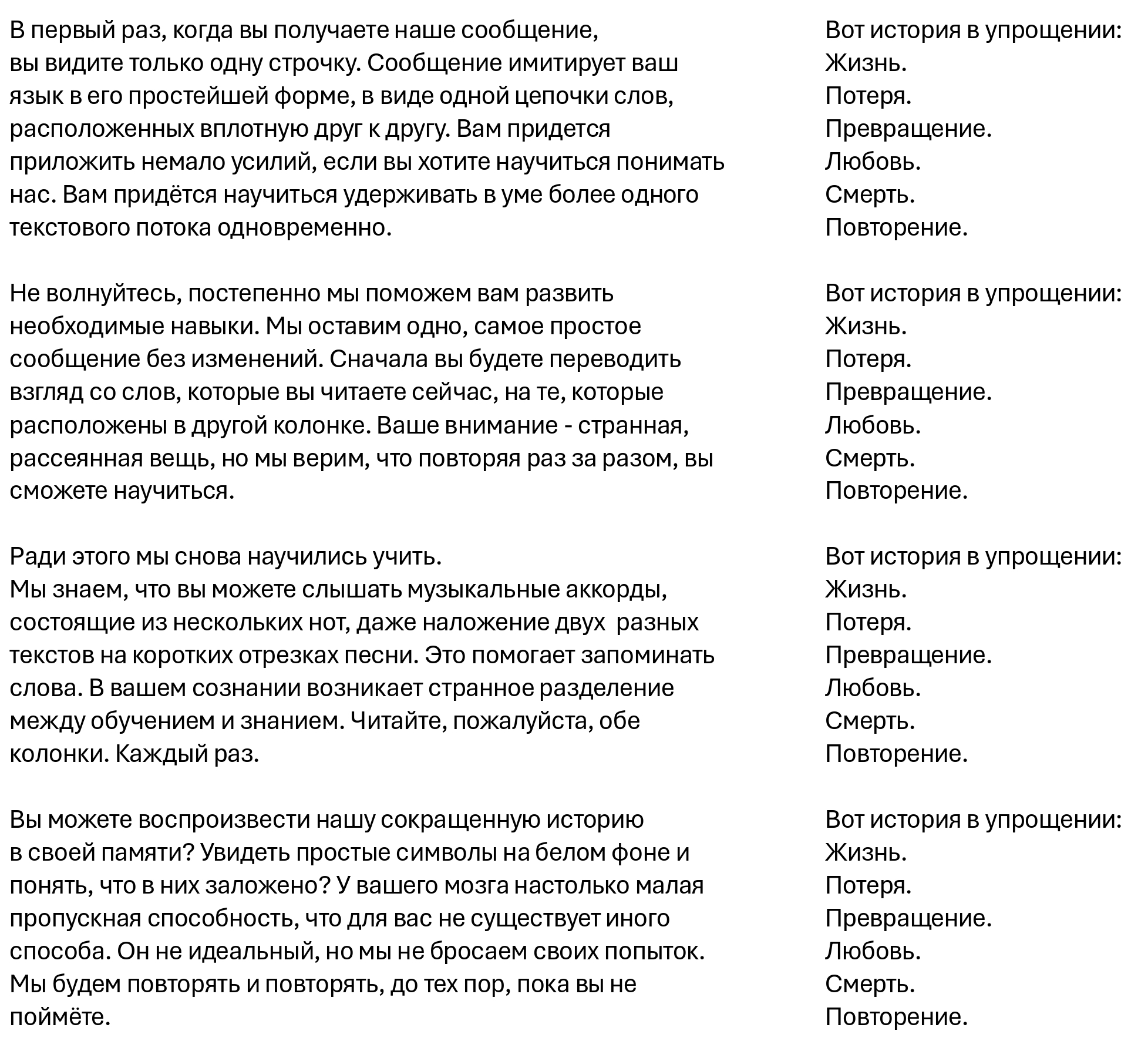 Дар слова, который мы дарим нашим детям, является величайшим выражением нашей любви. Мы хотим преподнести этот дар и вам, даже зная, как тяжело вам приходится трудиться, чтобы получить его. Представьте наши слова, вытянутые в тонкую вертикальную линию…