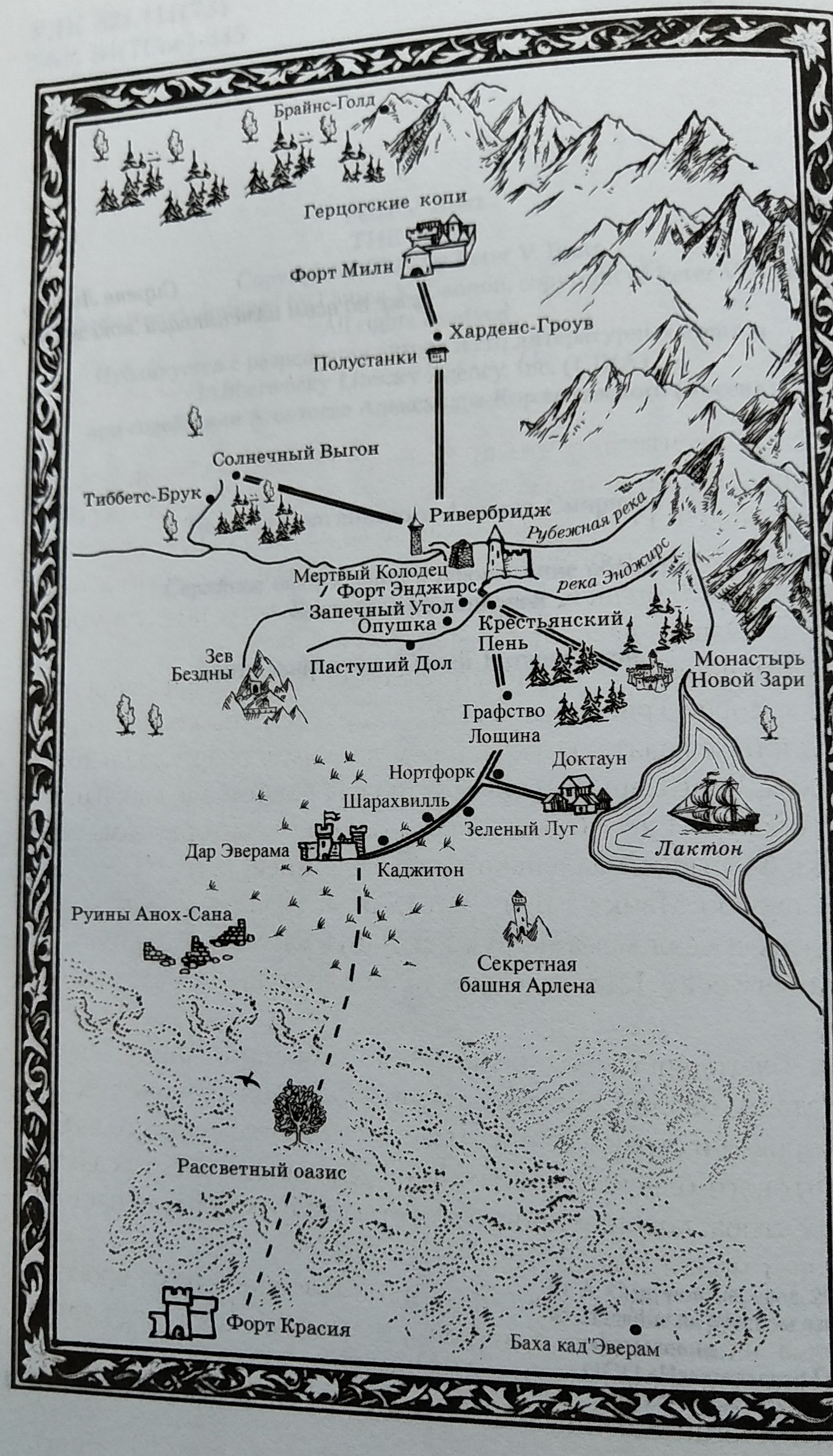 А вот последующие страницы представляют больший интерес. Для издания были нарисованы две новые карты. Одна представляет собой измененную карту мира книги, выполненную на более качественном уровне (правда нельзя не отметить, что масштабы и расстояния претерпели некоторые изменения). Другая — очень детализированная карта Форта Красия, в котором будет происходить существенная часть действия книги. Особенно интересно как различаются строения во внешнем и внутреннем городе.