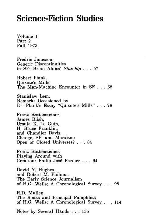 Зимой 1974 года мир научной фантастики был ввергнут в легкую суматоху с выходом тома 1, части 2 «Science Fiction Studies» — издания, выпускаемого факультетом английского языка Университета штата Индиана. Все началось со статьи Франца РОТТЕНШТАЙНЕРА из Вены, который ранее редактировал антологию научно-фантастических рассказов из Восточной и Западной Европы «Взгляд с другого берега» (от mif1959: на самом деле, речь идет о «Science Fiction Studies» 1973 года, в выпуске 1974 года было окончание дискуссии с репликой Мака РЕЙНОЛЬДСА, ответом своим оппонентам Франца РОТТЕНШТАЙНЕРА и итоговой статьей Фредрика ДЖЕЙМИСОНА).